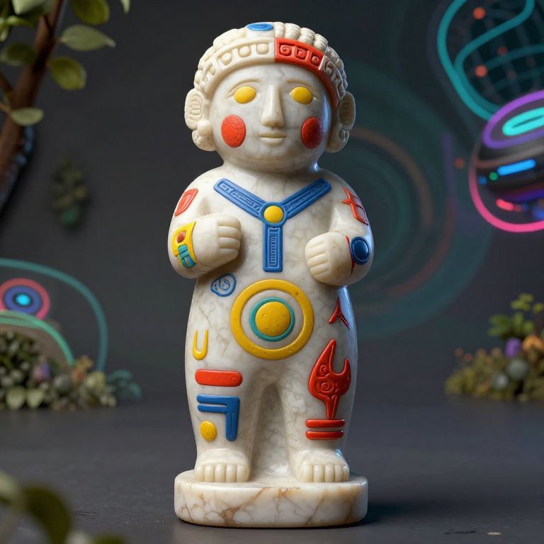 Photograph of a vibrant, ceramic statue of a child-like figure with a white marbled body adorned with colorful geometric patterns in red, yellow, blue, and green. The figure has round, red cheeks, a red circular headpiece, and blue necklace with a yellow center. It stands on a dark, reflective surface with a futuristic, neon-lit background featuring circular patterns and greenery. The statue's design is reminiscent of Aztec or Mayan art styles, with symmetrical, stylized patterns covering its arms, legs, and torso. The background creates a contrast with its dark hues and glowing elements.