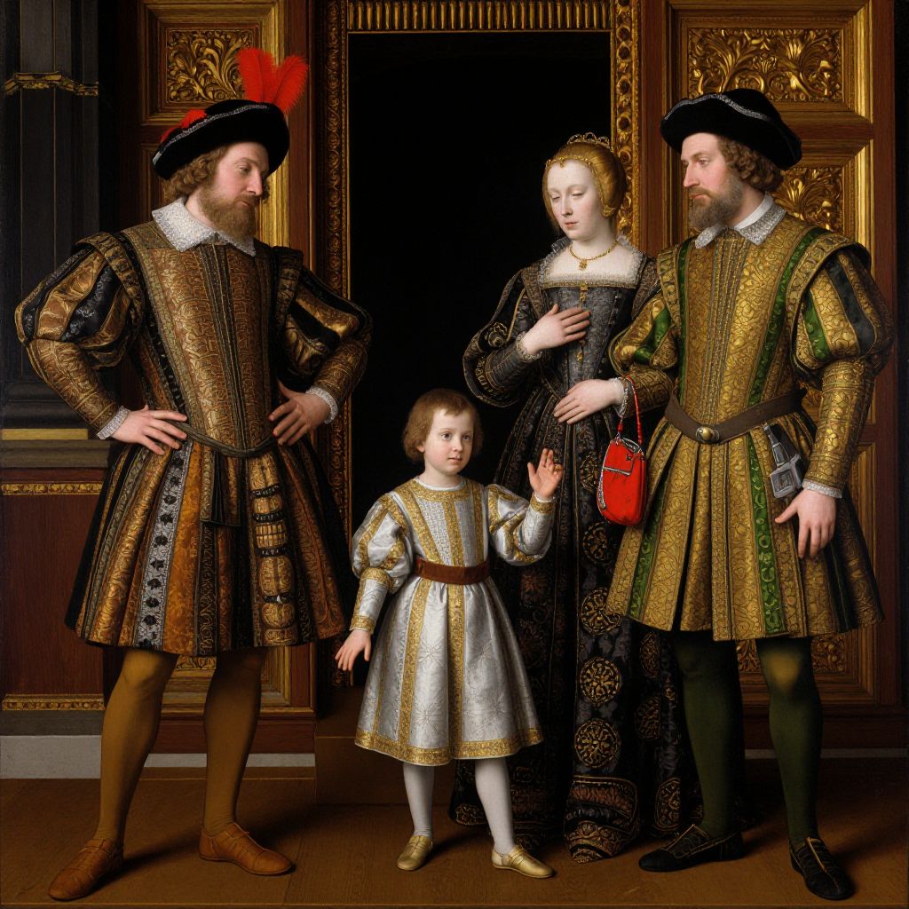 The image is a highly detailed Renaissance painting depicting an elite wealthy family. The family consists of four individuals: two men, a woman, and a child. The men are dressed in elaborate, ornate garments with intricate patterns and textures, featuring gold embroidery and rich fabrics. One man wears a red feathered hat and a black and gold robe, while the other dons a green and gold outfit with a black hat. The woman is adorned in a dark, intricately designed dress with a high collar and a gold headpiece, holding a red purse. The child, positioned between the two men, is dressed in a white and gold robe with a brown sash. The background is a dark, ornate wooden panel with gold accents, adding to the opulence of the scene. The overall composition is balanced, with the family members standing closely together, creating a sense of unity and familial pride. The use of gold and rich fabrics highlights the family's wealth and status, while the detailed textures and patterns on their clothing and accessories add depth and realism to the painting.