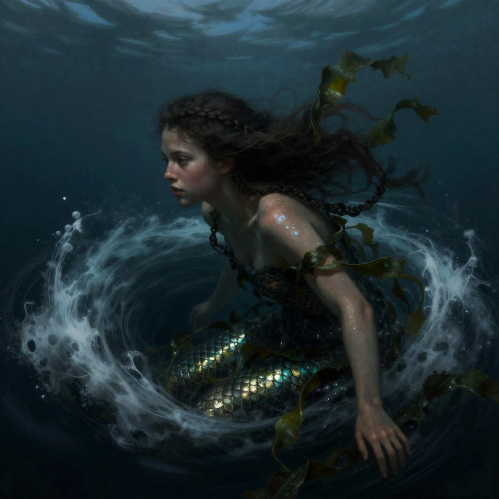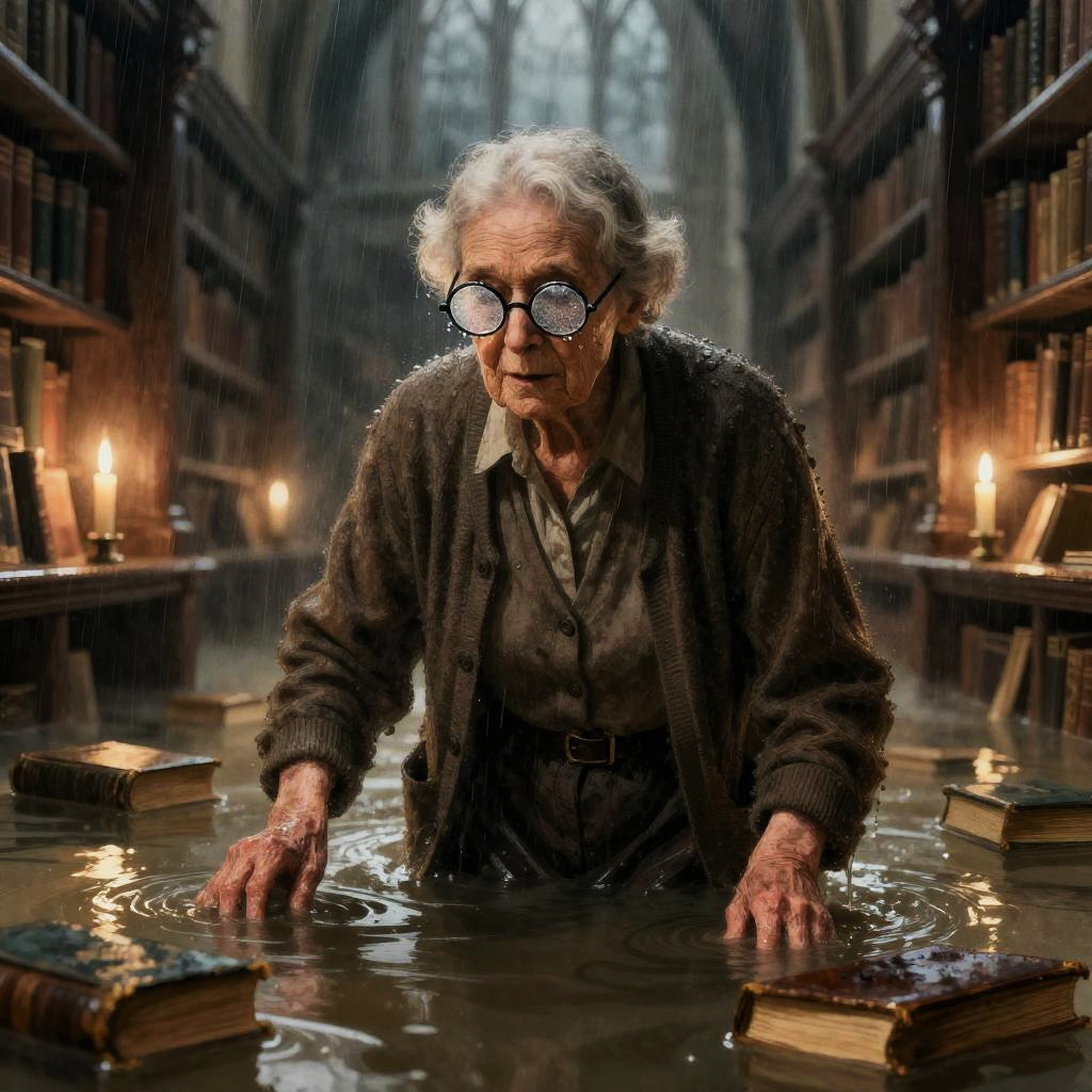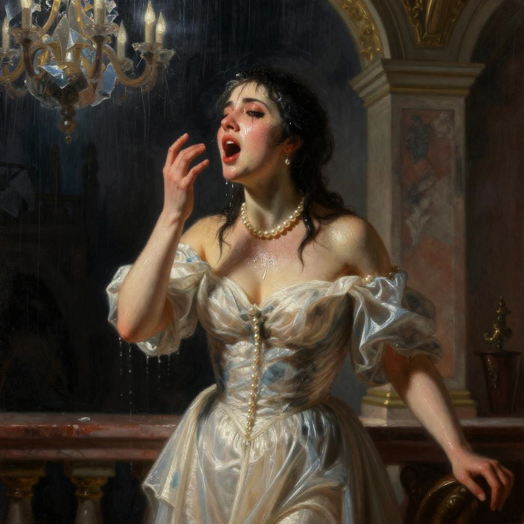 Opera singer is caught in a flooded marble opera house during a thunderstorm, completely soaked and voice cracking, with wet evening gown clinging to her form, pearl necklace weighed down by droplets, mascara streaks and a shattered chandelier casting reflections, illustrated in baroque cinematic oil painting with dramatic chiaroscuro.