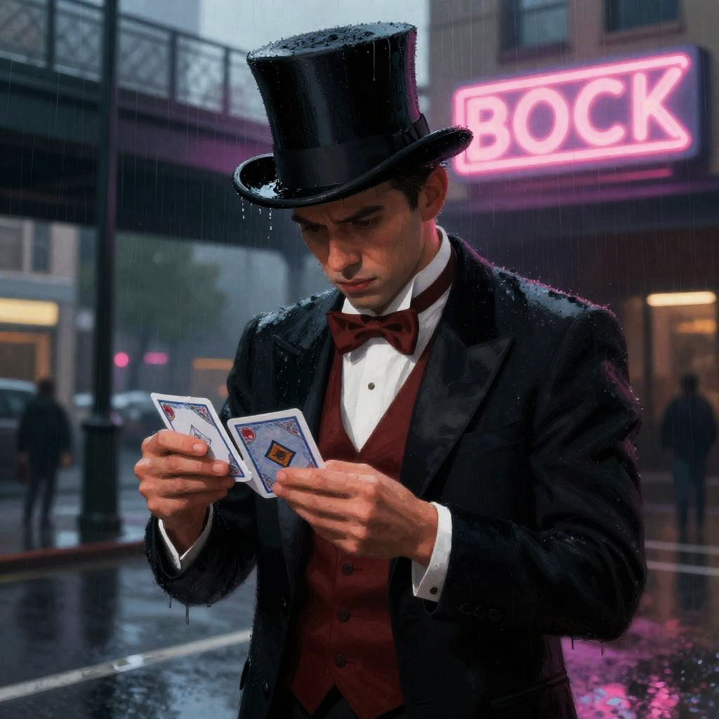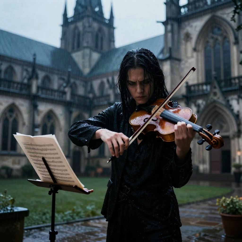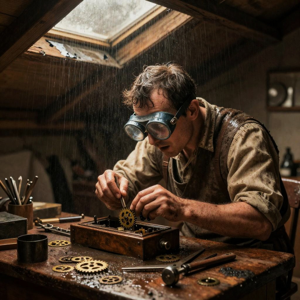 Opera singer is caught in a flooded marble opera house during a thunderstorm, completely soaked and voice cracking, with wet evening gown clinging to her form, pearl necklace weighed down by droplets, mascara streaks and a shattered chandelier casting reflections, illustrated in baroque cinematic oil painting with dramatic chiaroscuro.