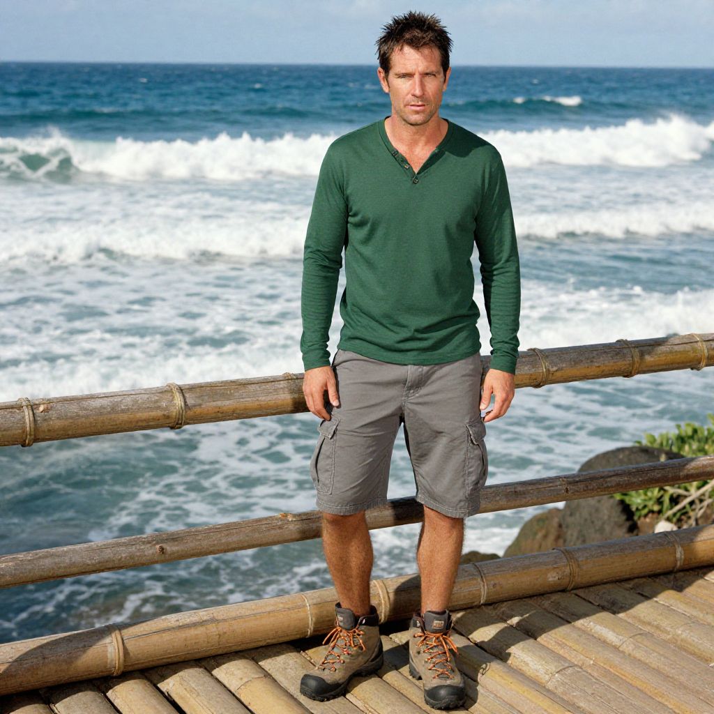 A man, forest green long sleeve henley, slate gray cargo shorts, rugged adventure style, hiking boots, sun-drenched bamboo deck, ocean waves crashing, 3M analog film stock, confident expression, relaxed posture. Man has masculine face and piercing eyes