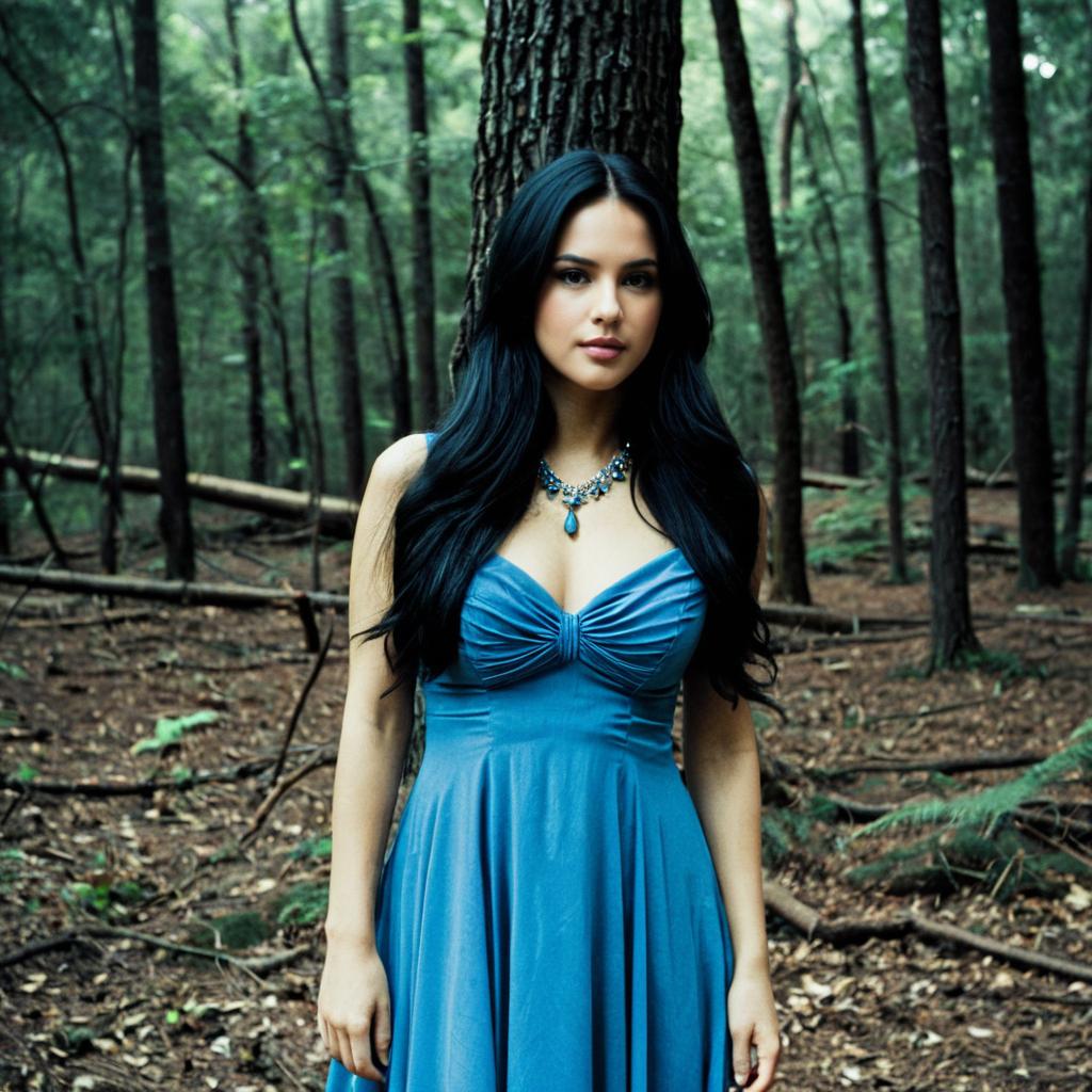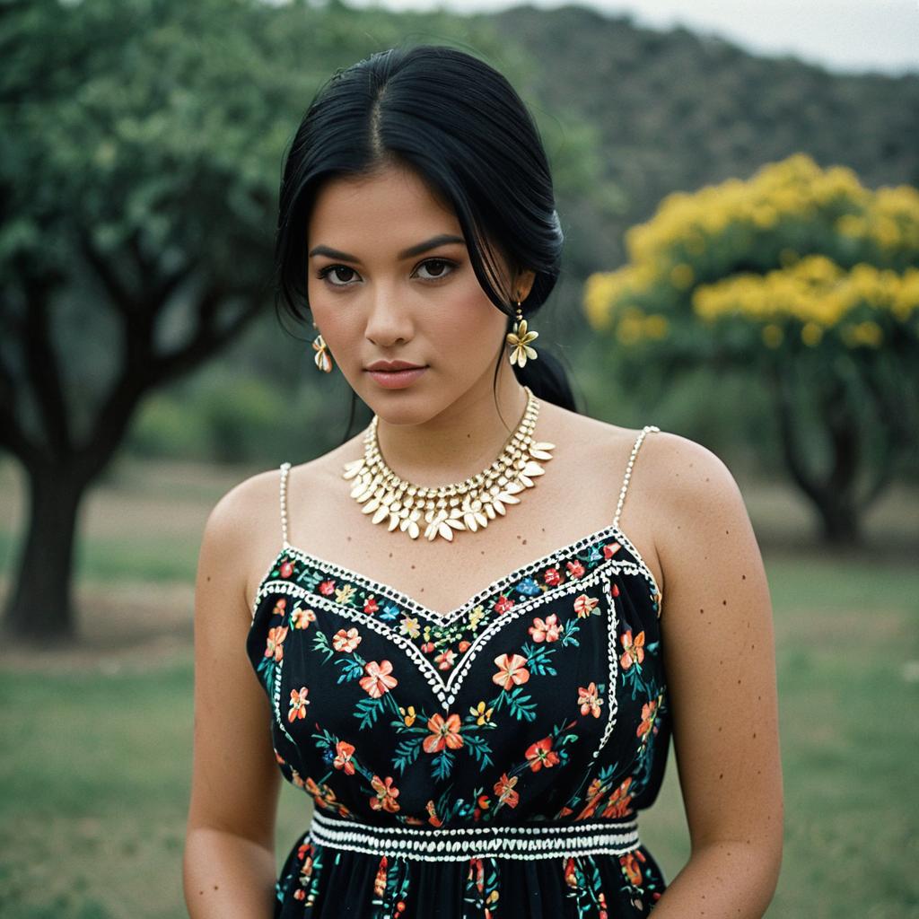 Portrait of a young woman with long black hair wearing a traditional purple dress with white floral embroidery, standing in front of a blooming purple flowering bush, looking directly at the camera.