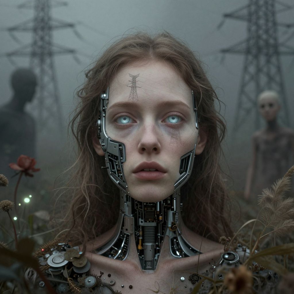 An enigmatic composition bathed in soft, diffused light, blending whispers of surrealism and melancholia, The scene unfolds in a cinematic atmosphere where subtle textures and delicate grains add depth, while the interplay of light and shadow enhances the quiet intensity of the moment, A subdued color palette merges with ethereal haze, evoking a dreamlike quality and timeless stillness, The central subject –\"Synthetic Dreams Fractured\": A woman’s face dissolves into machinery—a cybernetic implant fusing cold steel and organic fragility, Her glassy gaze reflects the faint outline of forgotten electrical towers in the misty background, Her disconnection from time and place reveals the inner anguish of technology supplanting memory and identity, – is delicately framed, their presence balanced between mystery and intimacy, Surrounding elements, rich in symbolic undertones, anchor the narrative in an otherworldly context, Organic details like softly swaying flora or faintly glowing surfaces contrast with stark, haunting figures, creating a juxtaposition that is both poignant and surreal, The composition invites introspection, with negative space amplifying the mood's resonance, from the atmospheric depth to the muted highlights, serves to craft an image that feels suspended in an emotional, poetic realm, surreal style