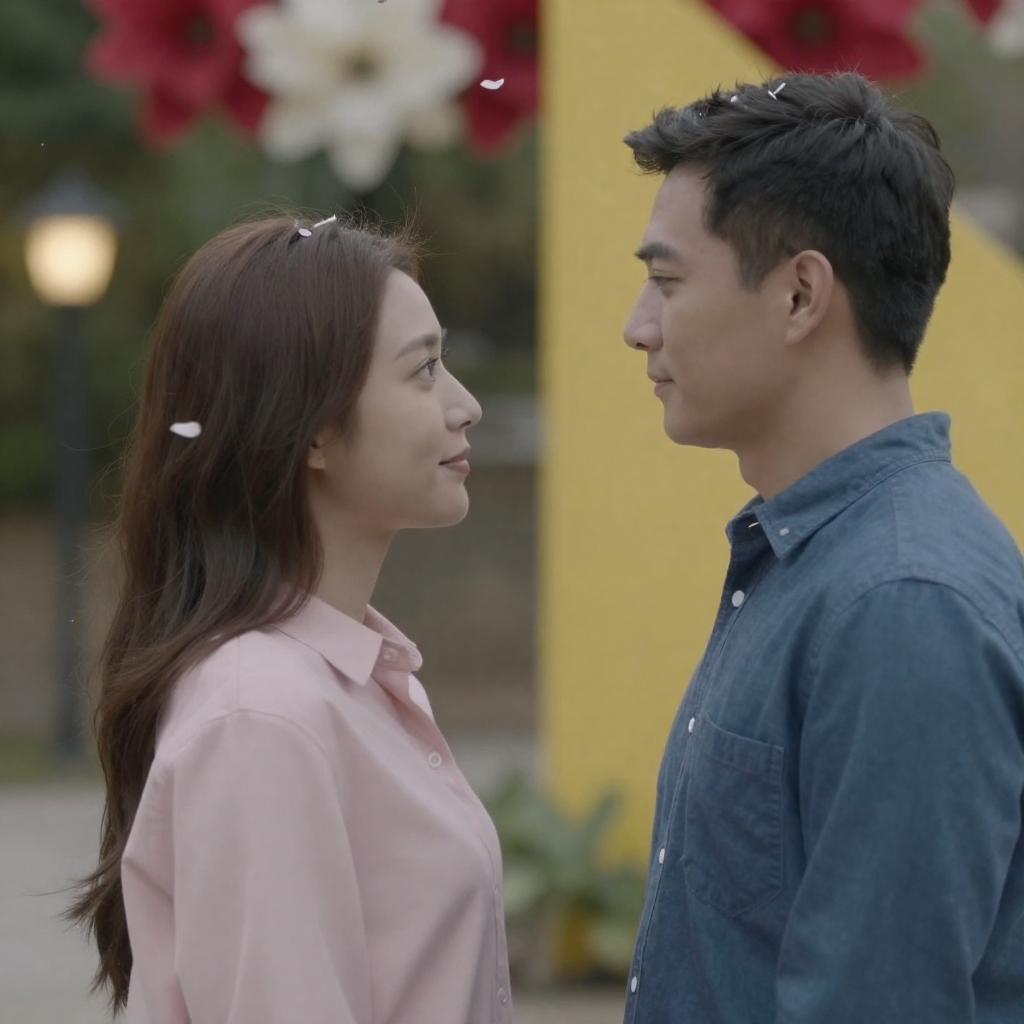 Photograph of a romantic dinner scene. A dark-haired man in a black shirt and a woman with brown hair in a red top lean towards each other, smiling, with glasses of wine and a plate of food on the table. Blurred background shows another couple. Warm, dim lighting enhances the intimate atmosphere.
