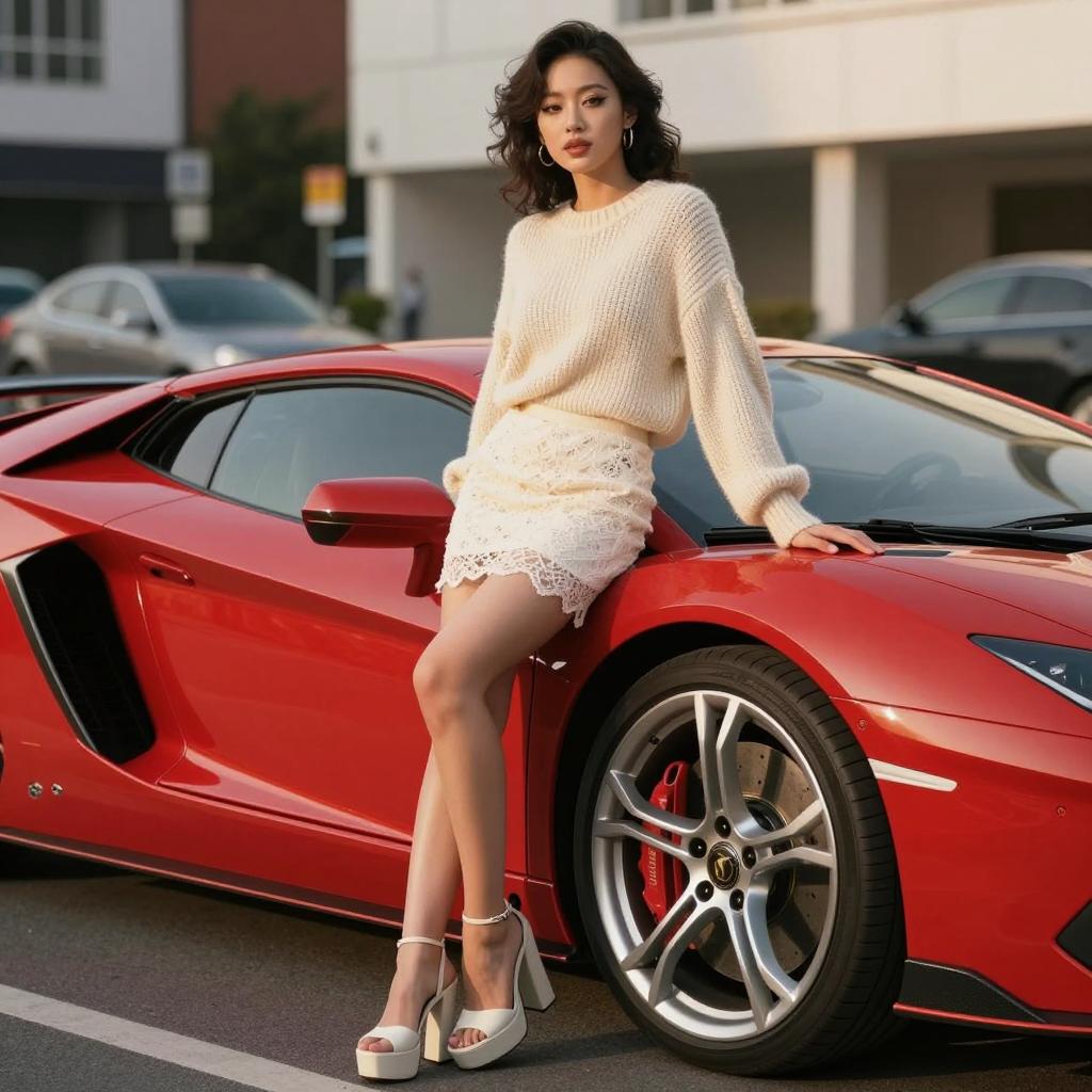 Hot woman in car, posed beside low yellow convertible sports car with door open wearing silky wrap blouse with tailored shorts and ankle-strap heels on Black woman with long straight hair and glossy nude lips, standing beside the driver's door, one hand on the roof and one on her hip in urban street with blurred buildings and traffic behind under soft overcast sky for gentle shadows and even tones from eye-level shot framed through the open door, glamorous automotive fashion photography, sharp focus, ultra-detailed