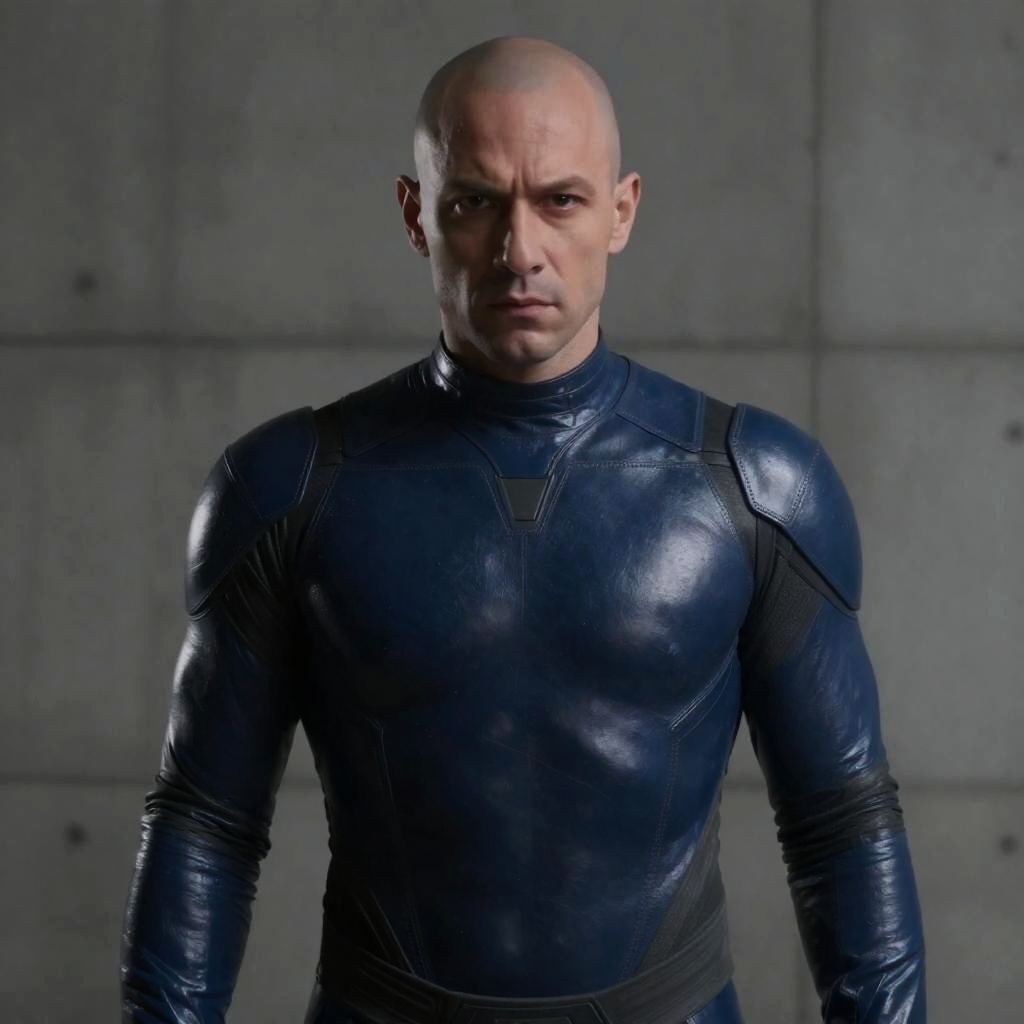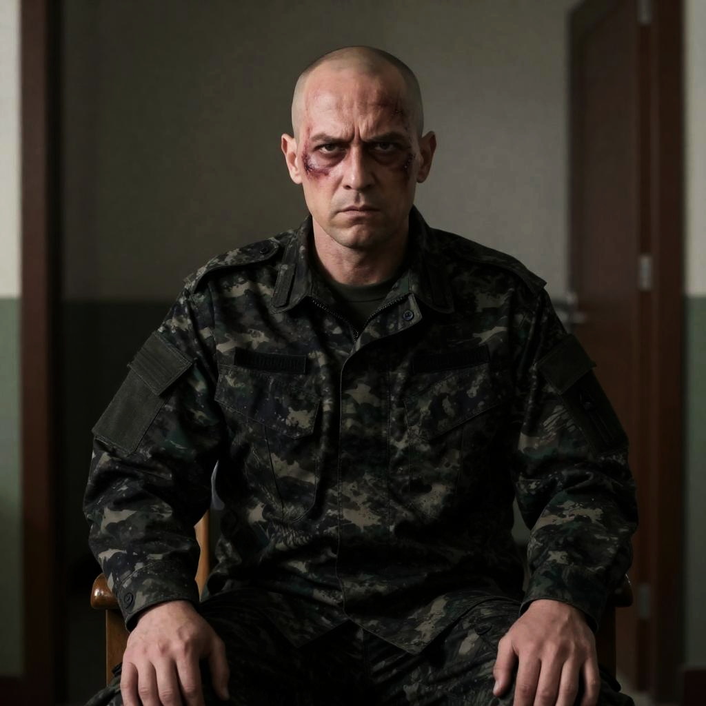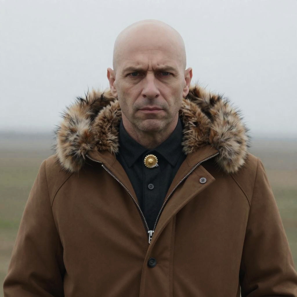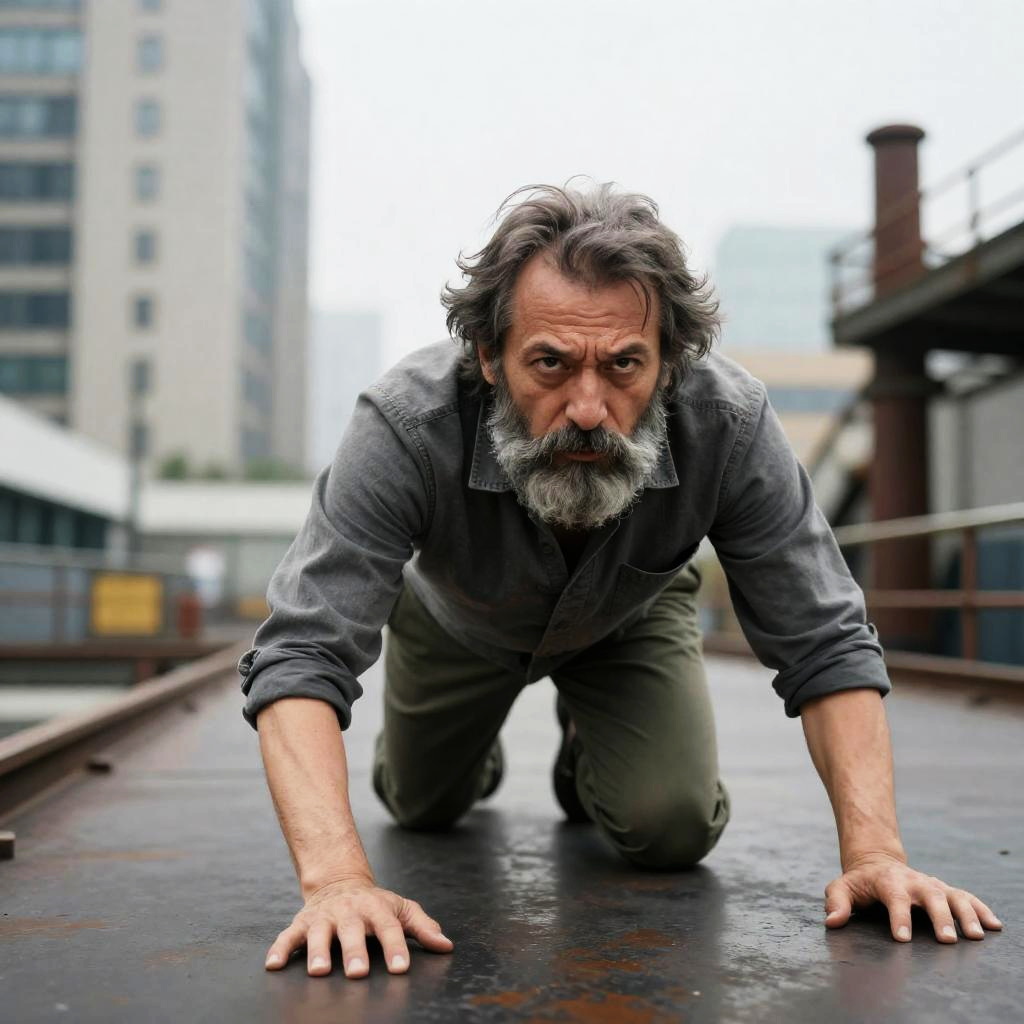 Bald man with intense expression, crouching on top of an orange cargo container, wearing a green shirt and dark pants, with industrial machinery in the background. His right hand rests on the container, left hand on his hip.