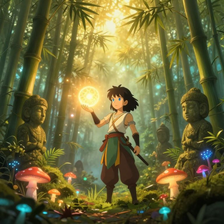 A captivating digital art scene unfolds, reminiscent of Studio Ghibli's enchanting landscapes. A young, resolute warrior with striking blue eyes stands steadfast in the heart of a foggy bamboo forest illuminated by an otherworldly golden glow. As seen from an angle that mirrors the perspective of the forest's smallest creatures, this perspective reveals the intricate beauty of bioluminescent mushrooms and age-old statues whispering tales to the attentive ear. The warrior holds aloft a radiant sphere of pure energy, eliciting a response from the surrounding vegetation with a spectrum of vivid colors, creating an emotional gradient that radiates hope and wonder throughout both the image and the viewer's heart.