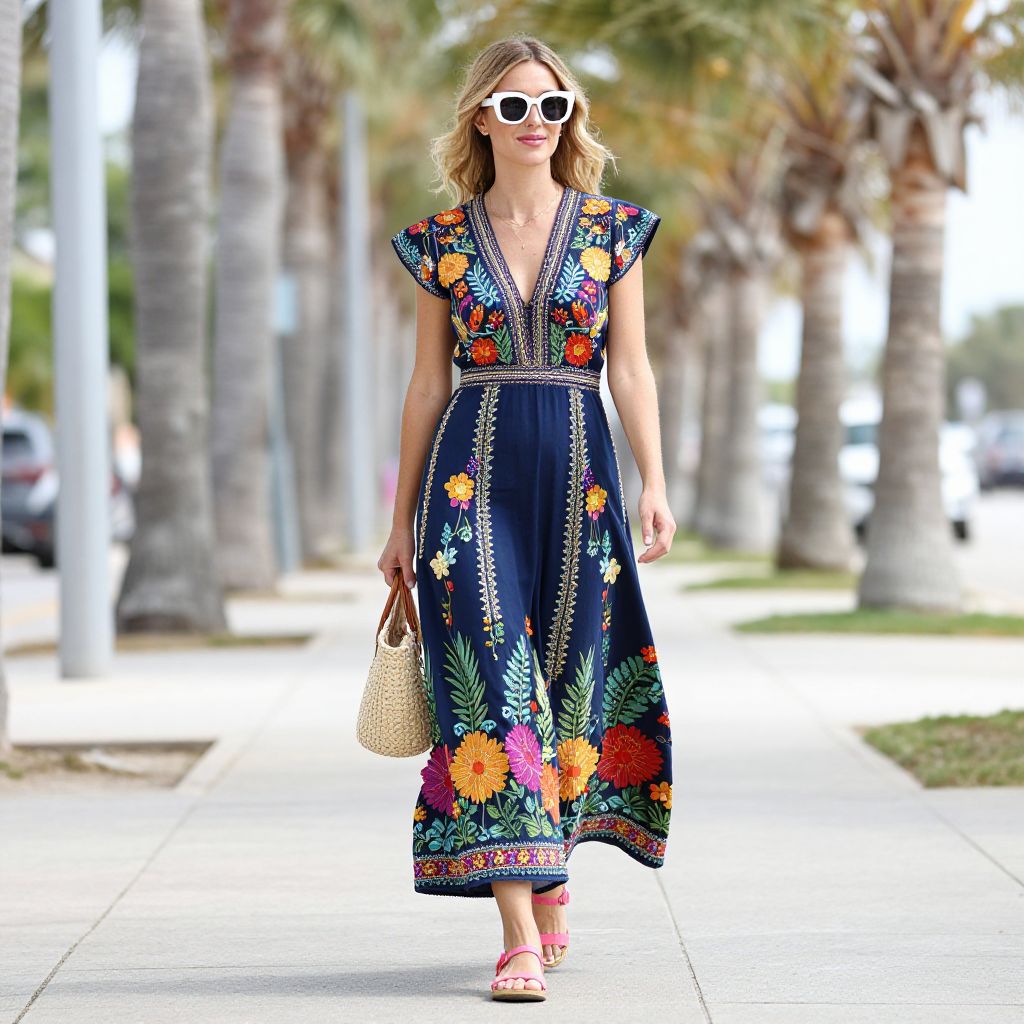 Woman strolling down a palm-lined sidewalk in a vibrant embroidered floral maxi dress, complemented by pink sandals, white sunglasses, and a straw bag, exuding a summery elegance.