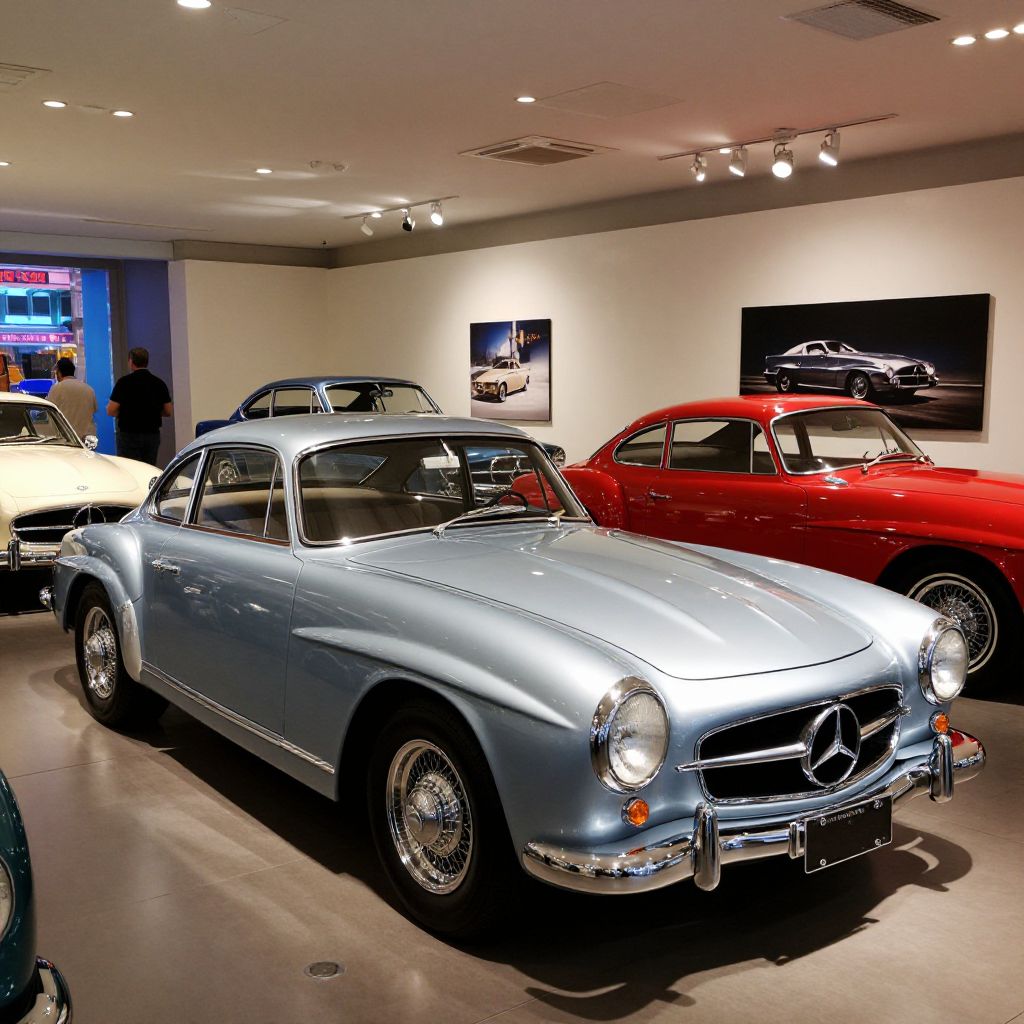 Vintage Mercedes-Benz coupes gleam under showroom lights at the Auto Collections museum and store within The Linq hotel-casino in Las Vegas, showcasing classic elegance alongside other timeless vehicles.