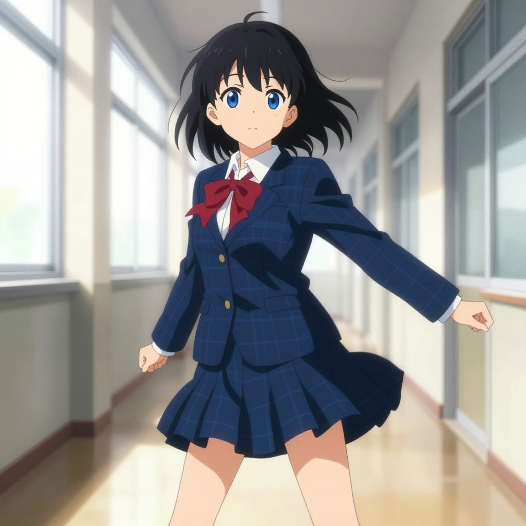Detailed anime-style illustration of a confident young female student with braided black hair and brown eyes wearing glasses. She is dressed in a stylish school uniform consisting of a wool blazer with gold buttons, a red bow tie, an orange sweater, and a blue skirt. The setting is a cozy contemporary café with large windows providing natural light and a view of a garden outside.