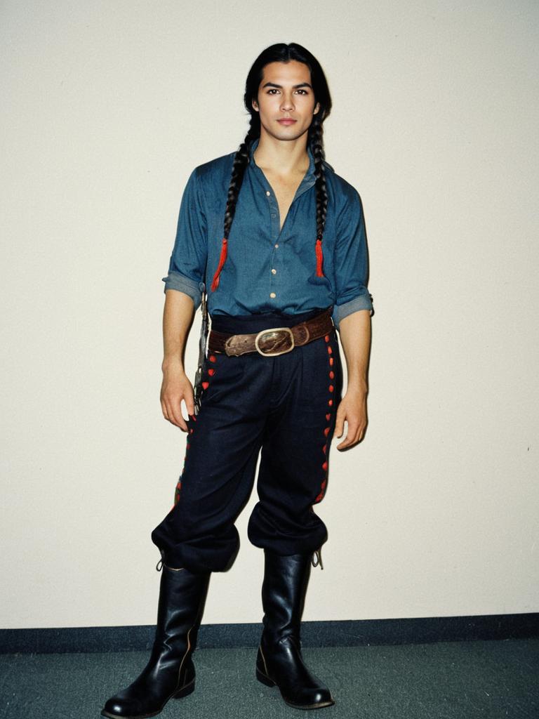 Luisa costume, solo, 1boy, male focus, standing, braid, full body, boots, looking at viewer, long hair, pants, black hair, closed mouth