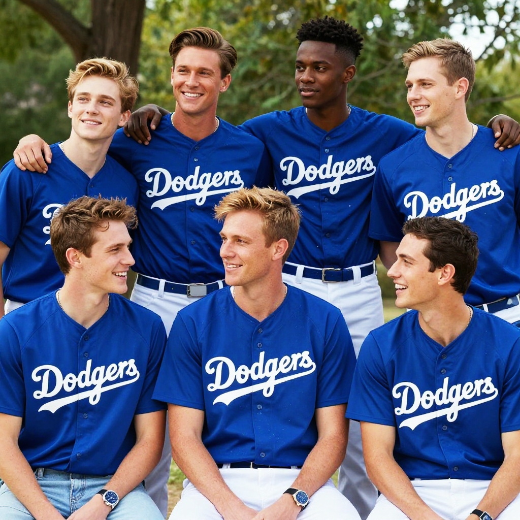 Photograph of six smiling young men, diverse in ethnicity, wearing blue Dodgers jerseys and white pants, standing and sitting outdoors.