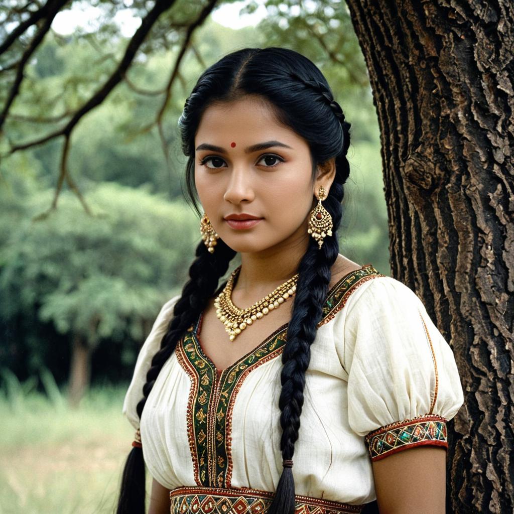Meera bai costume,1girl, solo, jewelry, necklace, outdoors, black hair, realistic, tree, long hair, braid, brown eyes, earrings