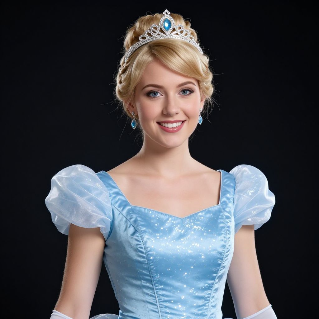 Portrait of a young blonde woman wearing a realistic Cinderella-inspired costume with sparkling blue dress, braided hair, and a jeweled tiara. The dress features puffed sleeves and glittering details, complemented by elegant earrings. The image is set against a dark background, emphasizing the classic fairytale princess look.