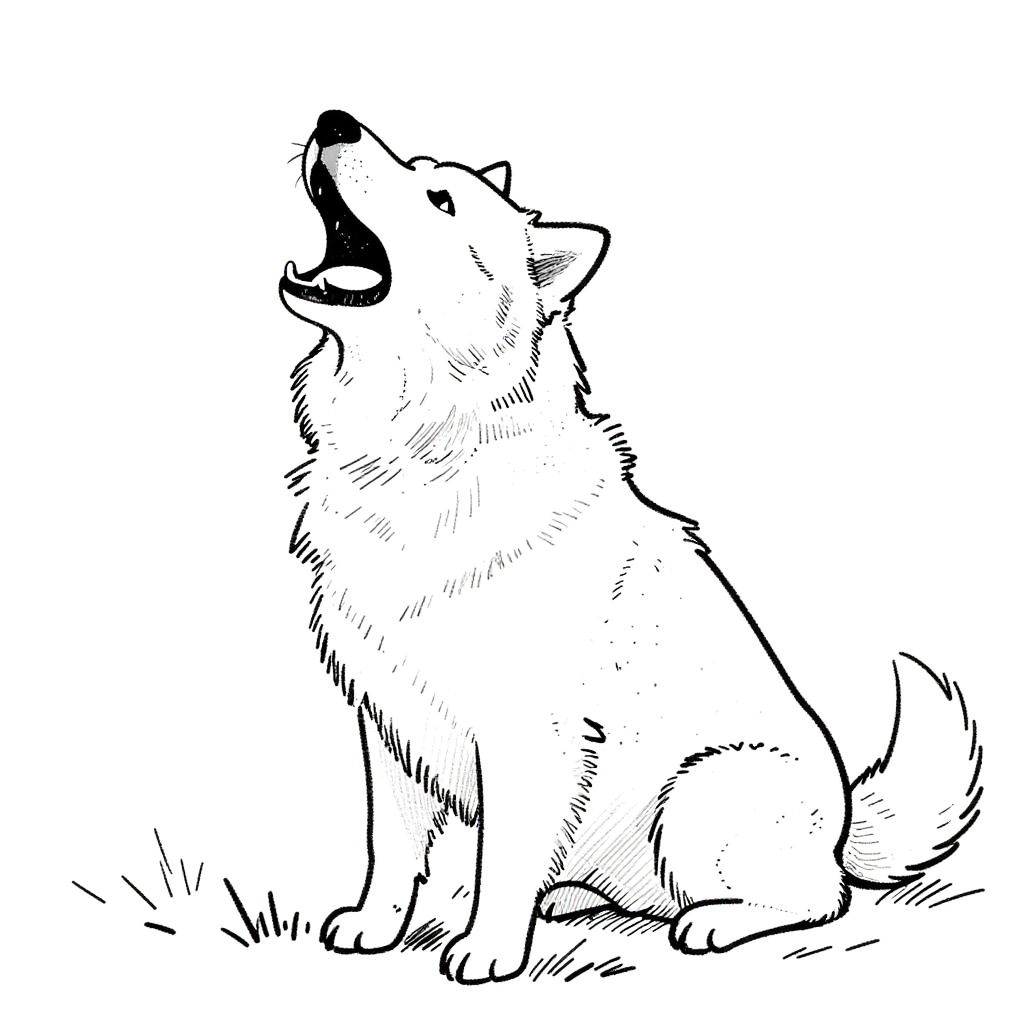 Black-and-white line drawing of a howling wolf sitting on grass, mouth open, head tilted upwards, eyes closed, and tail curled.