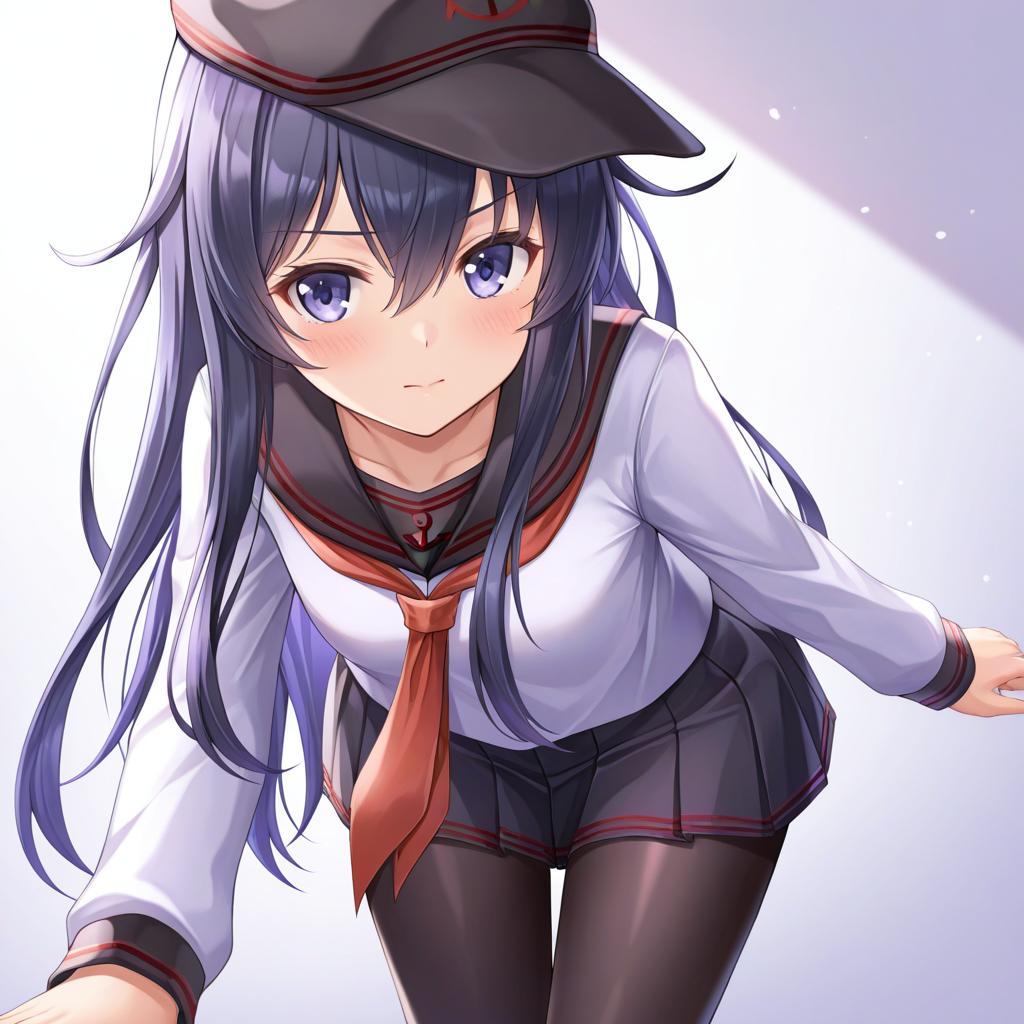 Akatsuki kai ni (kancolle), kantai collection, 1girl, purple eyes, hair between eyes, blue eyes, long hair, purple hair, black hair, serafuku, serafuku, flat cap, pleated skirt, black skirt, black pantyhose, long sleeves, anchor symbol, red neckerchief, by artist lunacle, illustrious