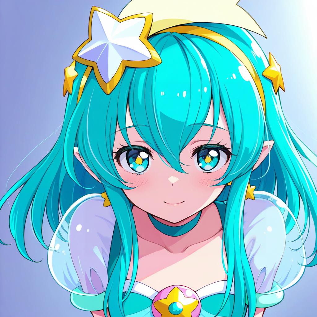 Cure milky, precure, 1girl, pointy ears, aqua eyes, blue eyes, hair between eyes, star-shaped pupils, star in eye, aqua hair, long hair, blue hair, medium hair, short hair, star hair ornament, yellow hairband, collarbone, see-through sleeves, choker, aqua choker, puffy short sleeves, star earrings, magical girl, magical girl, wrist cuffs, by artist chorimokki, illustrious