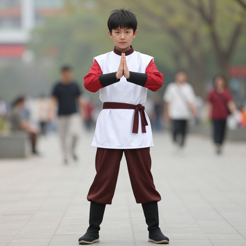 Photograph of an Asian boy in martial arts attire, standing with hands in prayer pose, blurred background, city park setting.