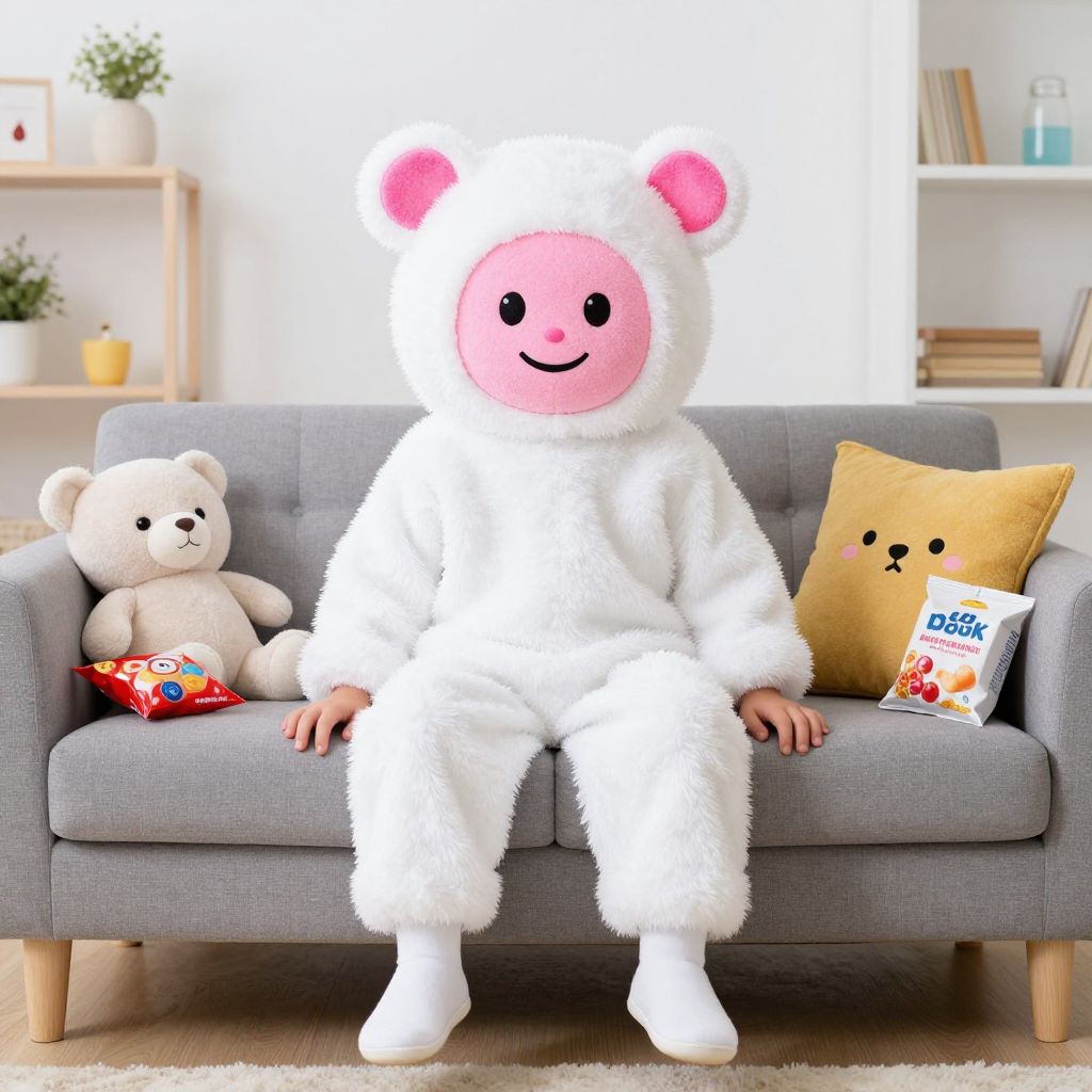 Photograph of person in white bear costume with pink face sitting on gray couch, surrounded by teddy bear, snack bag, and yellow pillow in bright