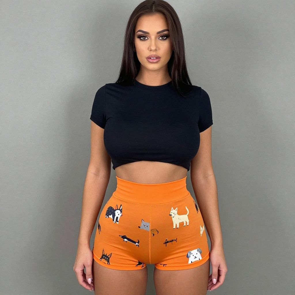 "Woman, casual streetwear, black cropped t-shirt, short sleeves, orange high-waisted shorts with cat and dog cartoon print, fitted waistband, plain background. Sexy. Pretty face and beаutiful eyes. Big breasts."