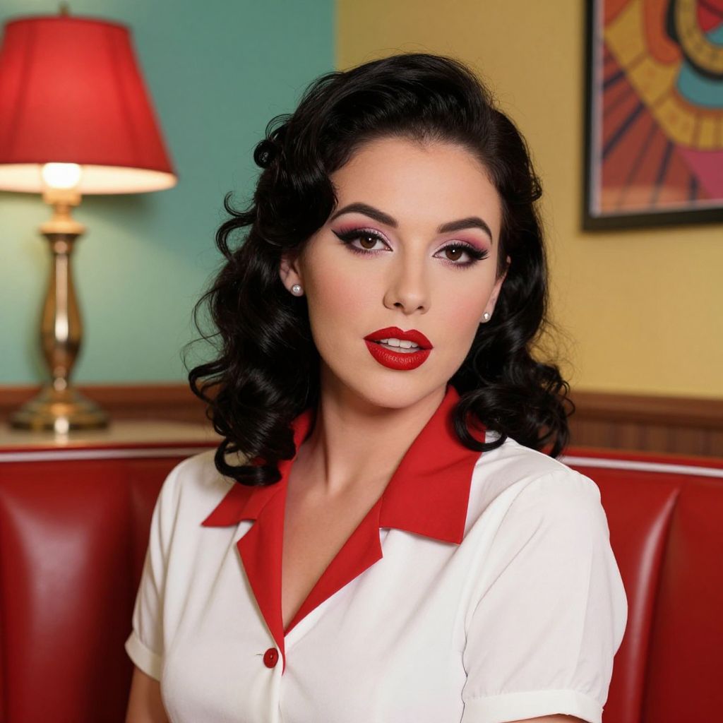 This is a vibrant, digitally-enhanced photo of a vintage-style woman with dark, curled hair and bold red lipstick. She has striking makeup with dark eyeliner and pink eyeshadow, and she's wearing a white blouse with a red collar. She's sitting in a red leather booth, with a retro red lamp and colorful wall art in the background. The lighting is warm, enhancing her classic, pin-up look.