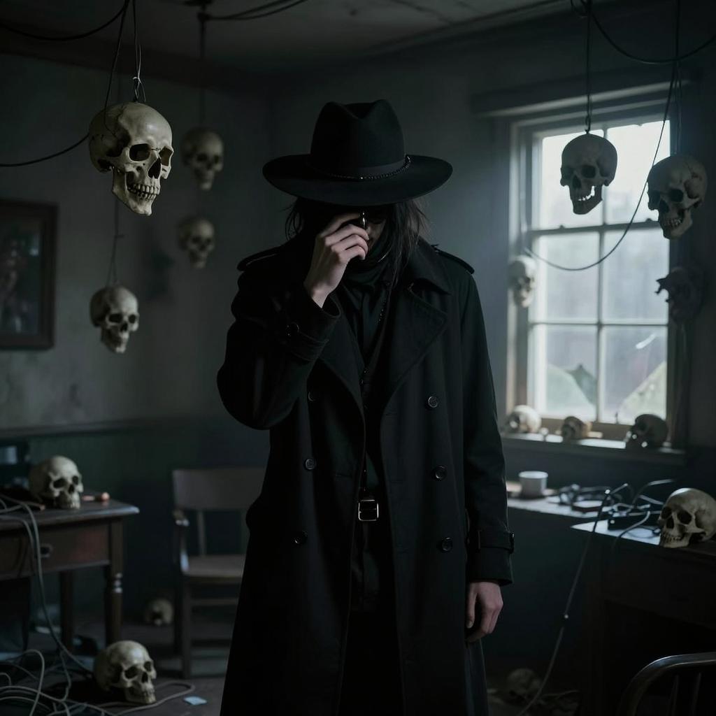 A dark and moody photograph of a person dressed in a long black coat and wide-brimmed hat standing in a dimly lit, cluttered room. The individual's face is mostly obscured by shadows and their hand. The room is filled with numerous hanging skulls and tangled wires, with light filtering through a broken window illuminating parts of the scene. The atmosphere is eerie and grim.