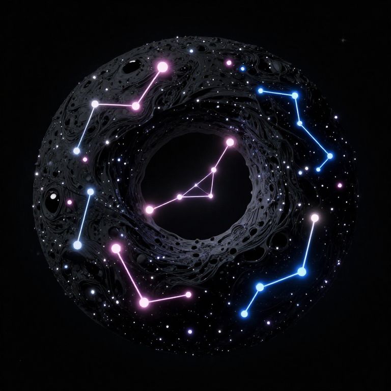 Digital artwork depicting a cosmic scene with a dark black background. A textured, swirling vortex forms the central structure, encircled by bright, glowing white and blue stars connected by neon pink and blue lines, forming a constellation pattern. The stars vary in size, with larger ones at key connections and smaller ones scattered throughout, creating a sense of depth and movement. The overall style is futuristic and abstract, evoking the vastness of space and the interconnected nature of celestial bodies.