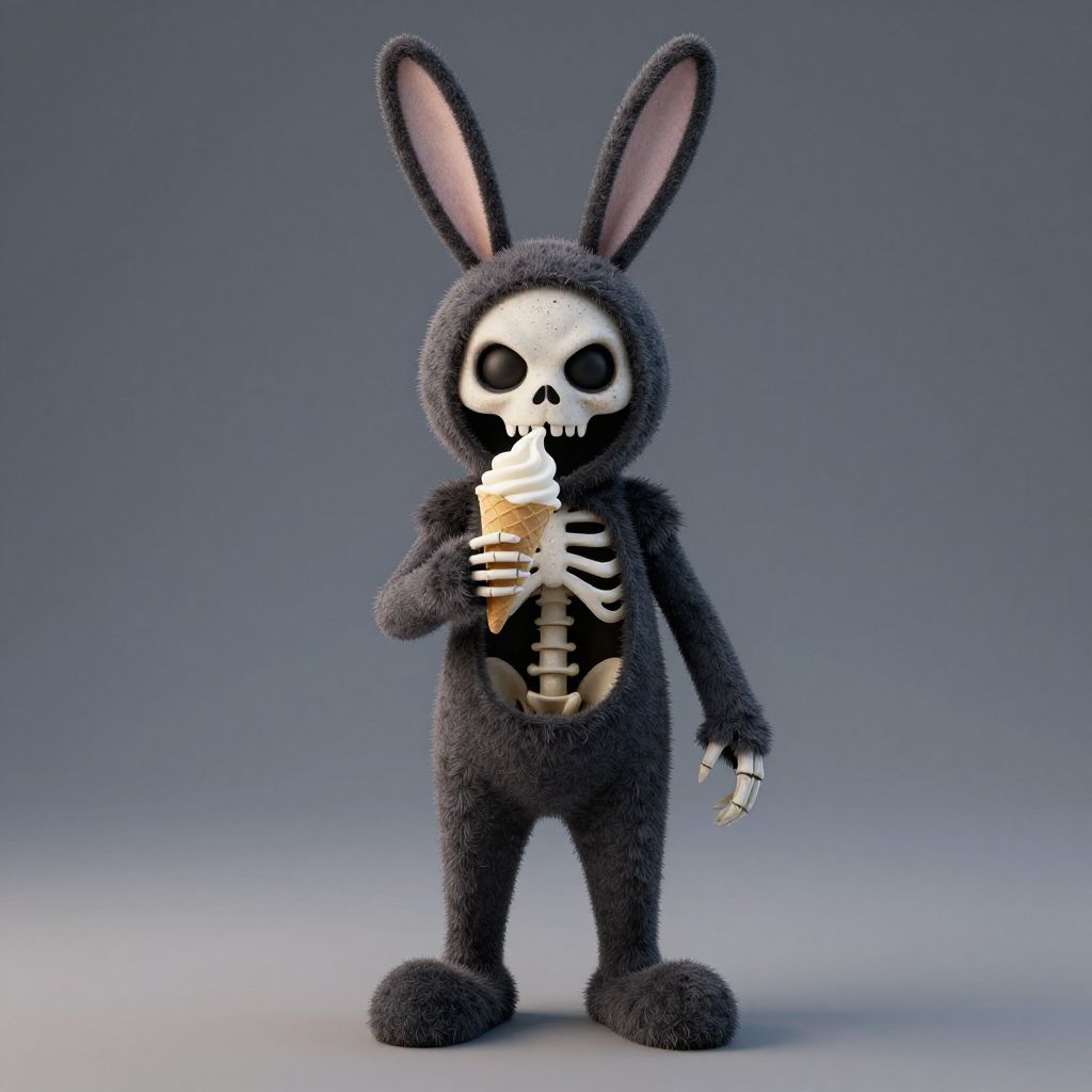 "Incomparable Rotten skeleton, scary, killer rabbit costume eating ice cream, photorealistic, octane render, unreal engine, volumetric lighting, hyper-detailed. Full body. - Remix by,"