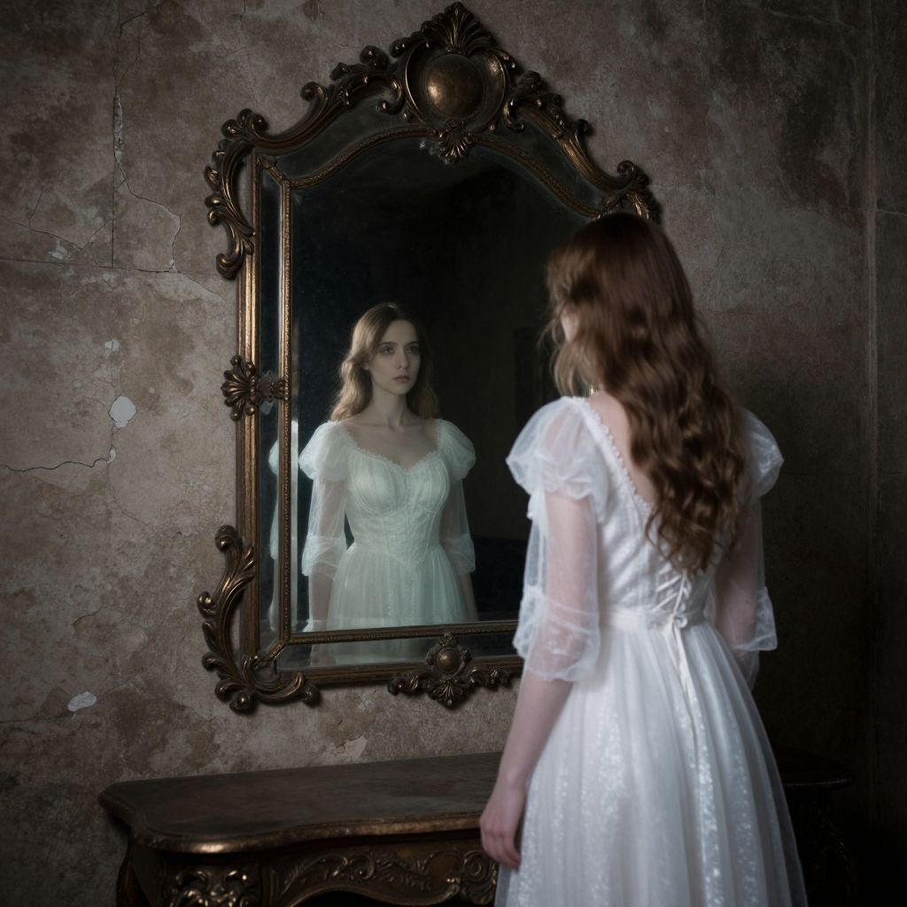 In a dimly lit chamber of cracked walls and aged stone, a woman stands before a grand, ornate mirror whose reflection reveals not her own visage, but a ghostly echo of another self, clad in identical attire yet bathed in ethereal light, as if glimpsing a parallel existence just out of reach.