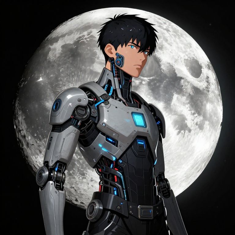 Digital anime-style illustration of a young male cyborg with short black hair and blue eyes, standing against a large, bright full moon in a black sky. He wears a sleek, futuristic black and silver armor with glowing blue and red accents, and a blue square panel on his chest. His left arm is fully robotic, with intricate mechanical details. The cyborg's expression is serious and focused. The moon's surface has detailed craters and textures, contrasting with the smooth, shiny armor. The overall style is highly detailed and vibrant, with a strong emphasis on sci-fi elements.
