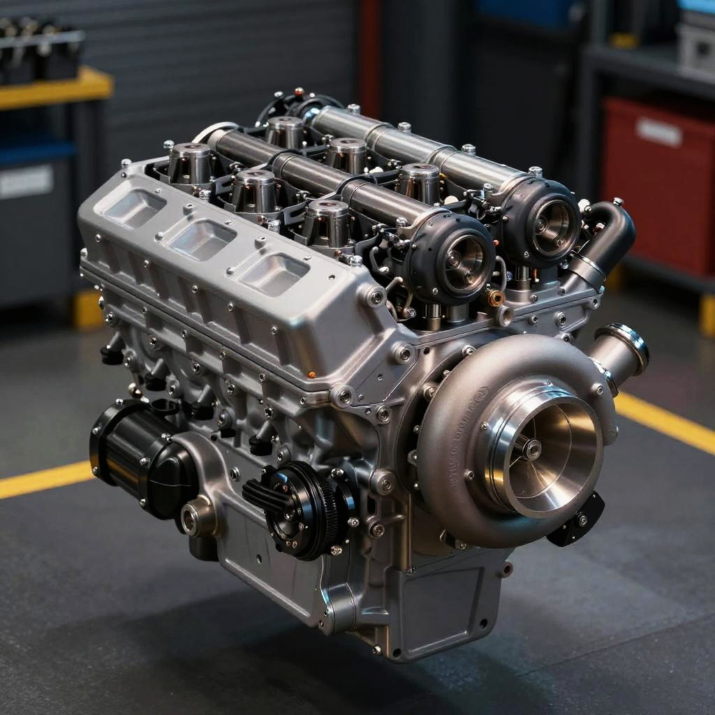 V20 car engine, powerful and complex V20 engine with exposed cylinders and turbochargers, set against a dark garage background, emphasis on mechanical details and brushed metal surfaces, cinematic lighting, high resolution technical illustration