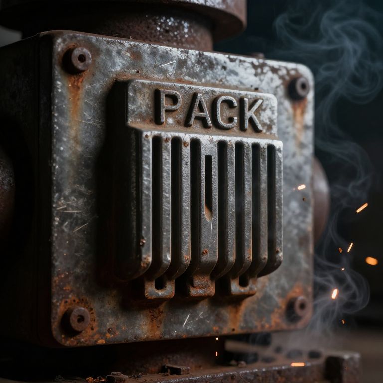 Close-up photograph of a rusted, metal "PACK" button with vertical ridges, emitting small sparks and wisps of smoke. The metal surface is heavily corroded, with visible rust and wear. The button is square with rounded edges, and the word "PACK" is prominently embossed in uppercase letters at the top. The background is dark and out of focus, emphasizing the button and sparks. The image has a gritty, industrial texture, highlighting the aged and worn condition of the metal.