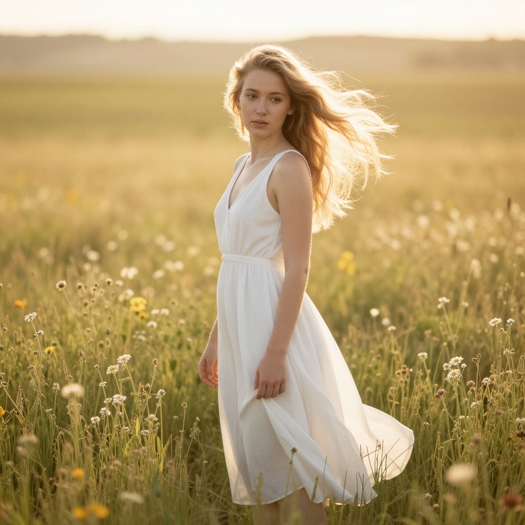 Woman standing amidst vibrant wildflowers, holding a delicate purple bloom while bathed in warm sunlight, symbolizing self-compassion and connection with nature.