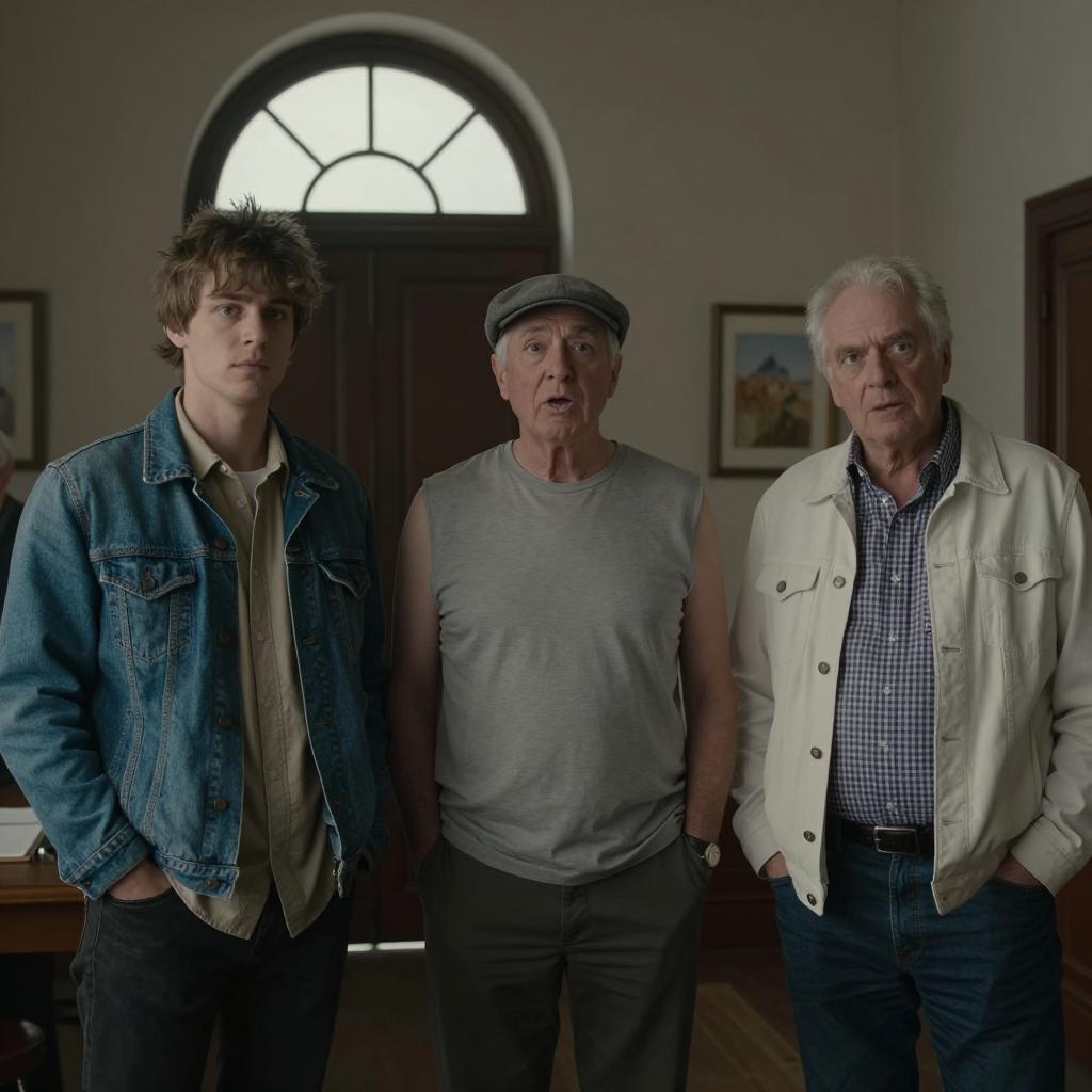 Three people in a photograph. Elderly white man with white hair, red lips, beige vest, light blue shirt. Middle-aged woman with dark hair, open mouth, pink cardigan, white blouse. Young man with brown hair, brown suit, blue shirt, looking down. Background includes wooden paneling. Elderly man and middle-aged woman have intense expressions. Middle-aged woman in the center. All three close together, slightly leaning forward.