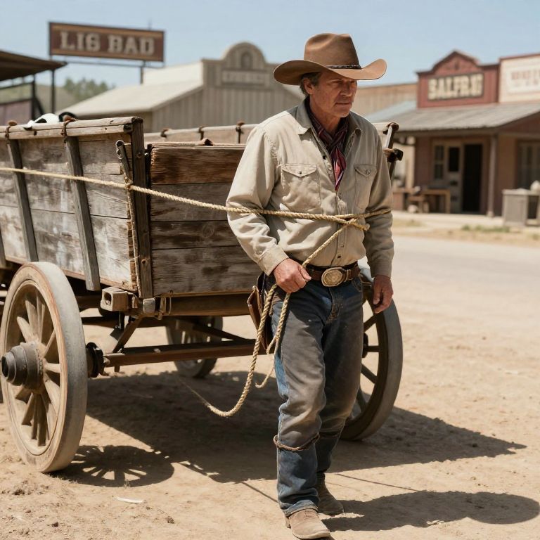 Photograph of a middle-aged Caucasian man with a rugged, weathered appearance, wearing a brown cowboy hat, beige button-up shirt with chest pockets, and blue jeans. He stands beside a wooden wagon with large spoked wheels, holding a rope in his right hand. The background features a sunny, dusty Western town with old wooden buildings, including a "Lig Bad" sign and a "Saloon" sign. The man's expression is serious, and he looks directly at the camera. The scene evokes a historical, Old West atmosphere with bright sunlight casting sharp shadows.