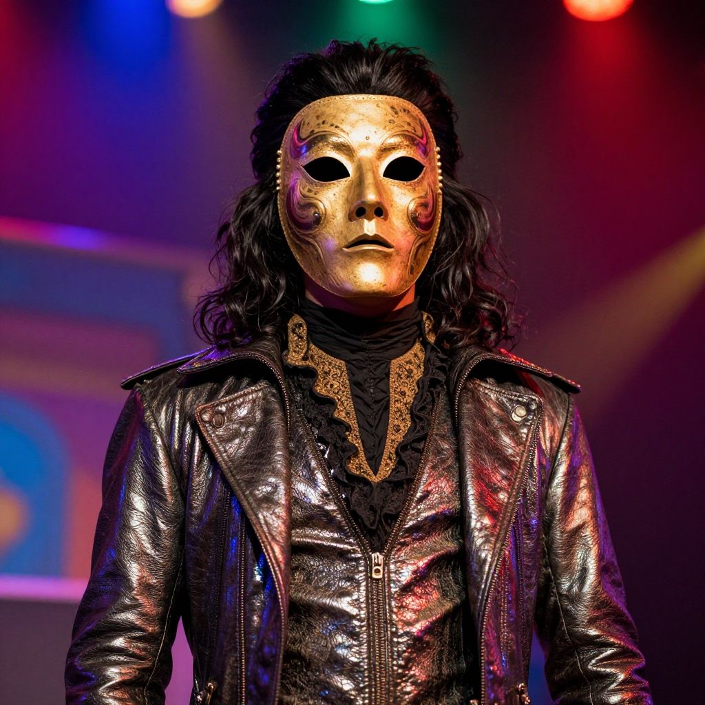Phantom of the Paradise costume, vintage 1970s rock opera style, shiny metallic textures with leather and lace, vibrant stage with colorful lights, detailed facial mask with haunting eyes, surreal and theatrical vibe