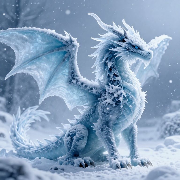 Ethereal ice dragon perched gracefully amidst a swirling blizzard, its frost-covered wings and spiky mane shimmering against the snowy landscape.