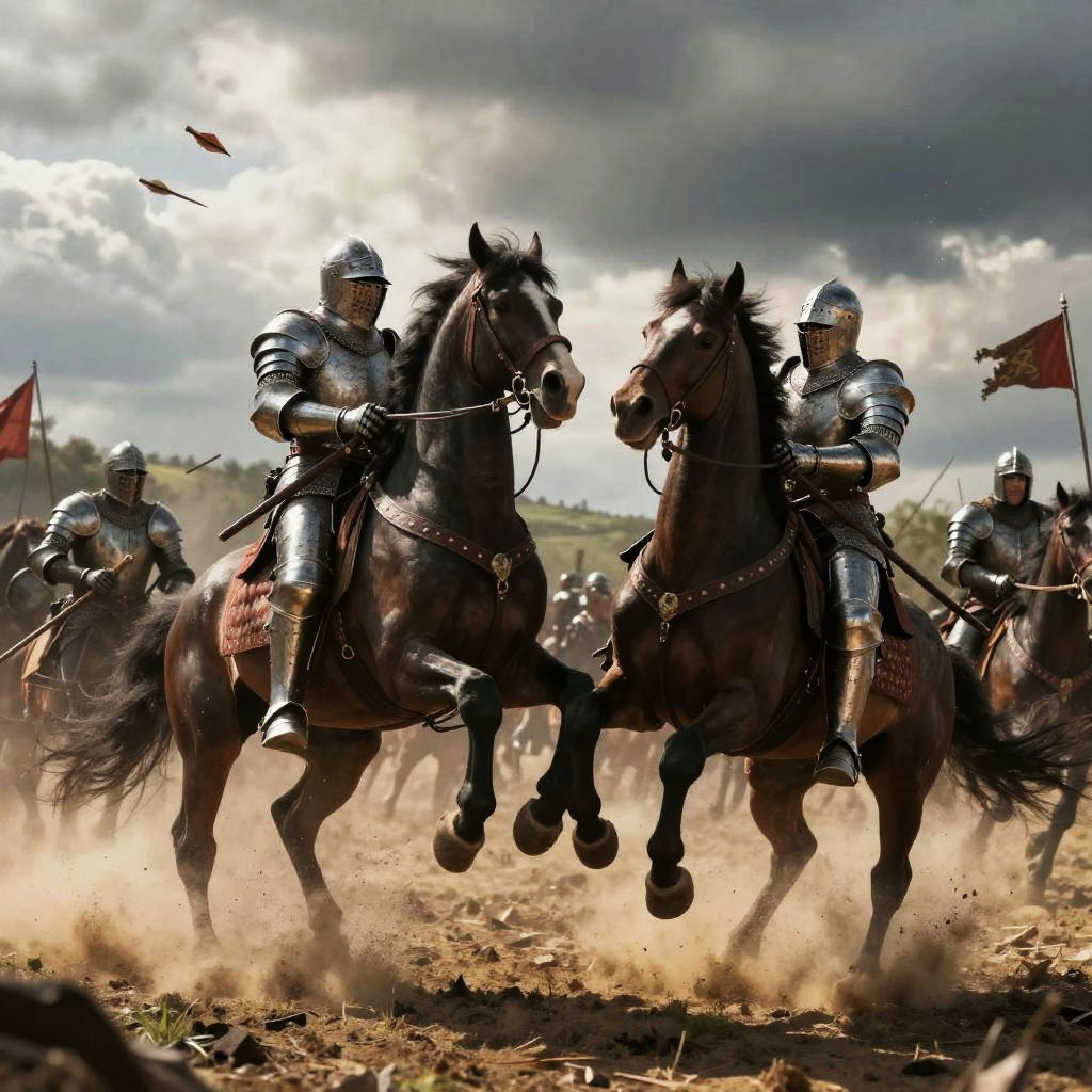 Fight scene generator depicting a medieval battlefield, knights in shining armor locked in combat, horses rearing, flying arrows, dramatic clouds overhead, gritty textures, realistic smoke and dust effects, intense facial expressions, epic cinematic style