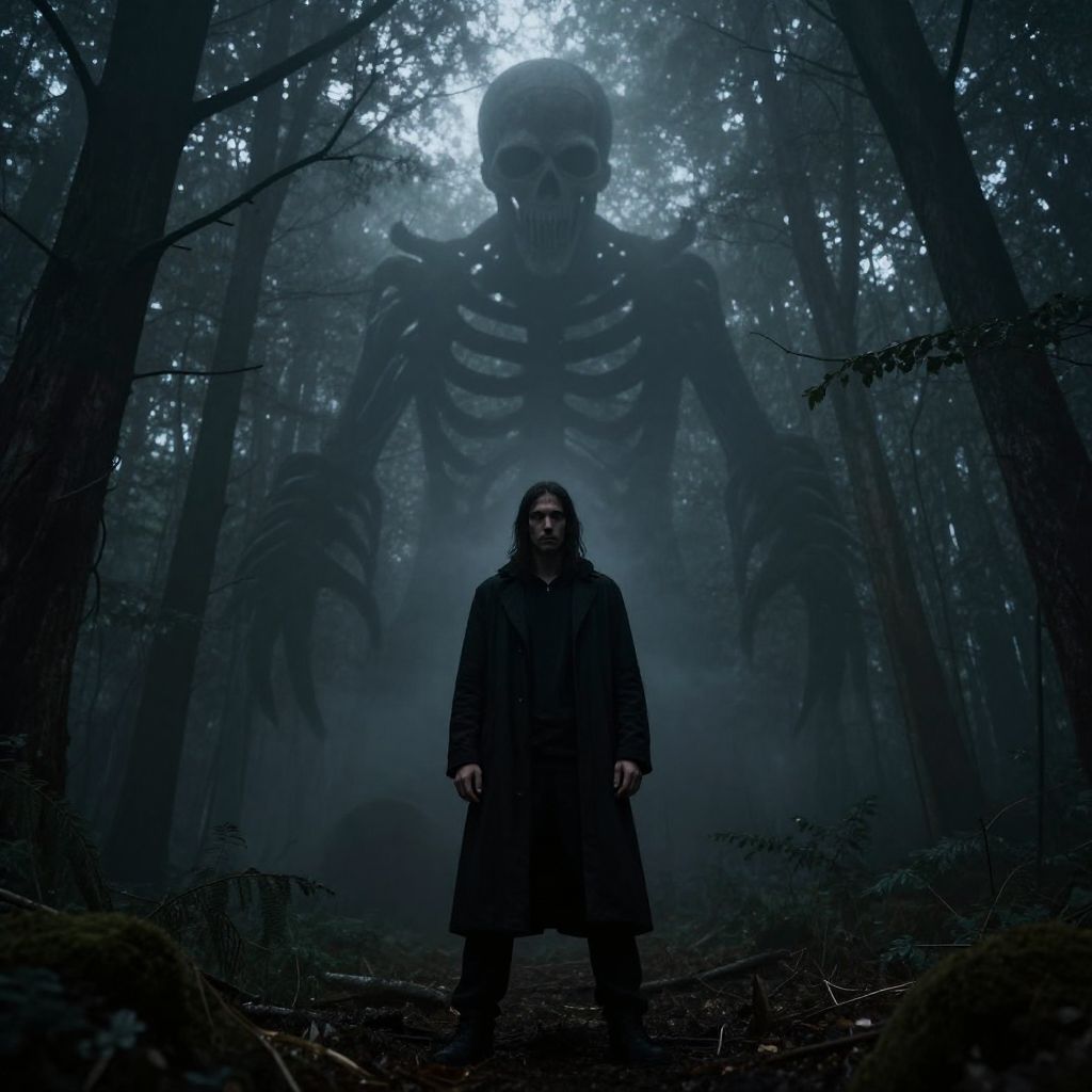 Photograph-style digital art depicting a dark, misty forest. A tall, menacing skeletal creature with a human-like skull and ribcage looms in the background, partially obscured by fog. In the foreground stands a tall, dark-haired man in a long, black coat, looking up at the creature with a serious expression. The forest is dense with tall trees, and the ground is covered in damp, fallen leaves. The overall color palette is dark blue and black, creating a spooky, eerie atmosphere. The creature's skeletal form is illuminated by a soft, ethereal light from above, highlighting its skeletal structure.