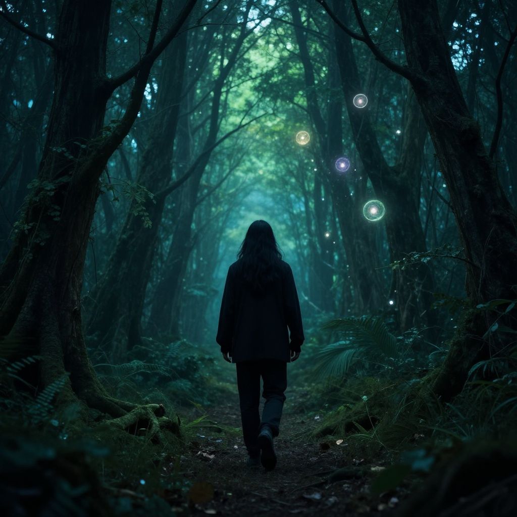 Dramatic, moody scene: A solitary figure stands tall amidst the dense, foreboding darkness of an eerie forest, shrouded by swirling mist that obscures his surroundings. Behind him, a menacing, shadowy death symbol looms large, its presence ominous and unsettling. Captured in a low angle shot, emphasizing the subject Man has masculine face and piercing eyes