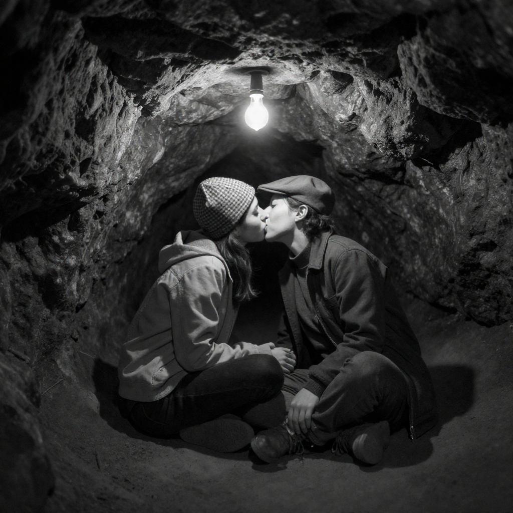 Black-and-white photograph of two people kissing inside a dark, rocky cave. Both wear hats and layered clothing; the person on the left has a checkered hat, while the person on the right has a flat cap. A hanging light bulb is visible above them. They sit on the cave floor, surrounded by rough, ured rock walls.