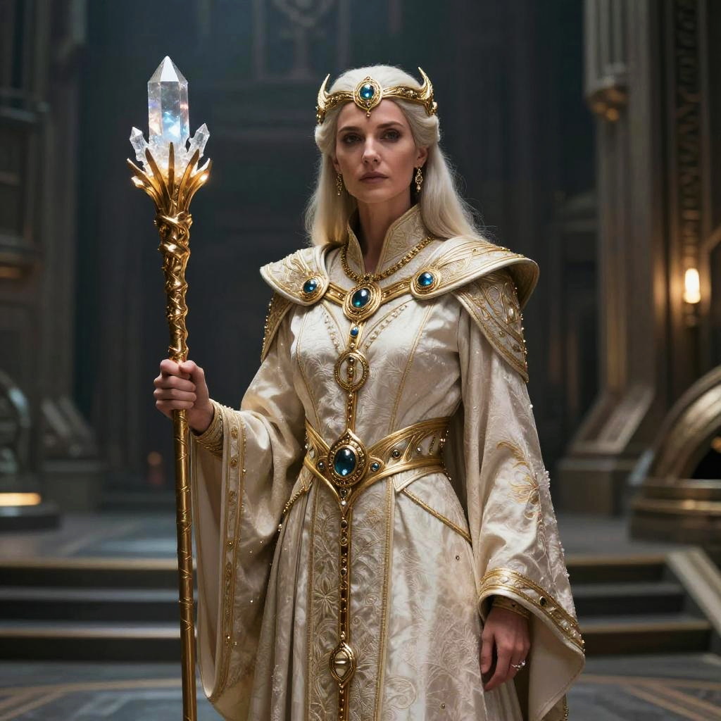 Photograph of a regal woman with long, platinum blonde hair, wearing an elaborate, cream-colored, ornate robe adorned with gold trim and large, blue gems. She holds a gold staff topped with a glowing, crystal-like orb in her right hand. Her head is crowned with a matching gold headpiece featuring a central blue gem. The background is a dark, opulent hall with dim lighting and intricate architectural details. The woman stands on a patterned floor with steps leading up behind her. The overall style is fantasy or medieval.