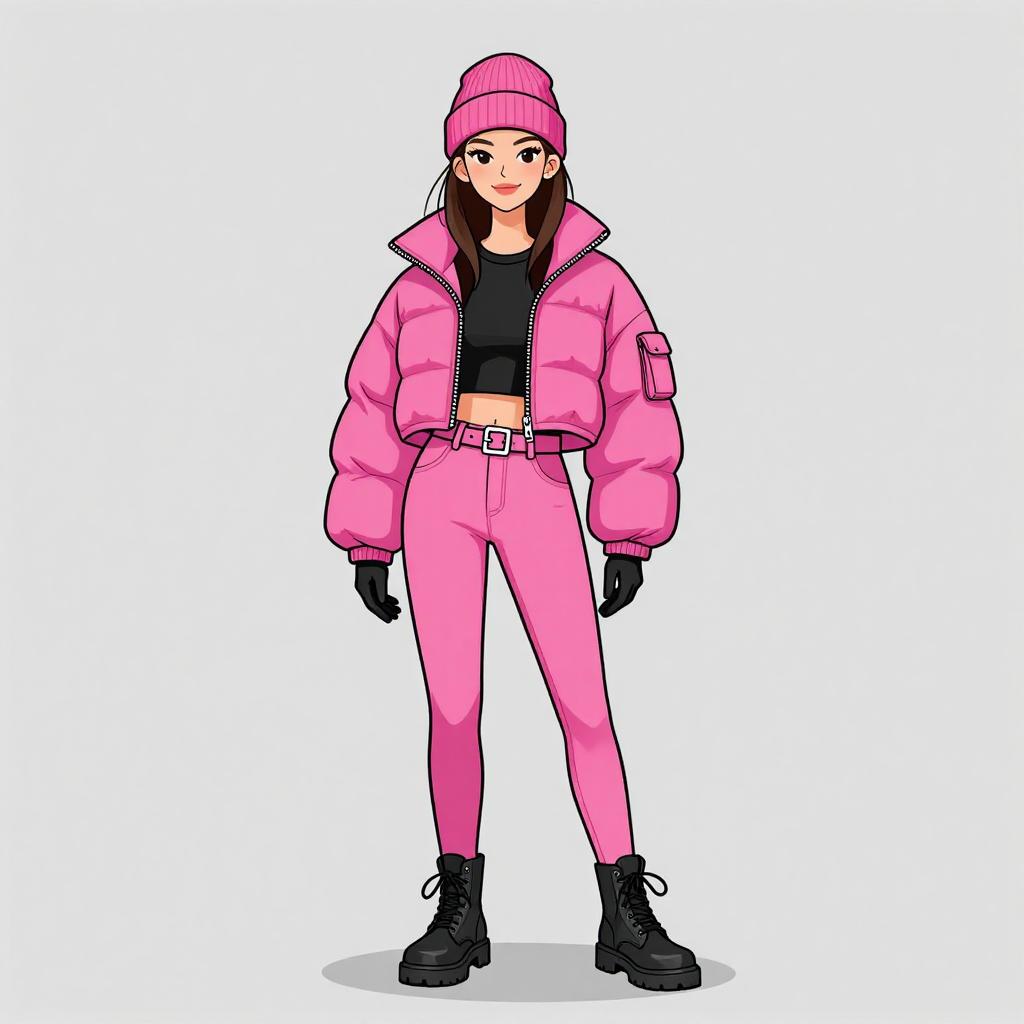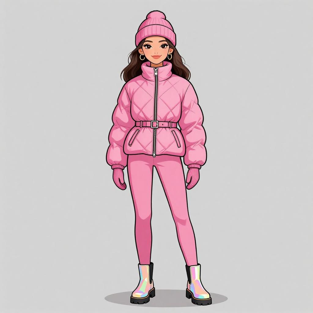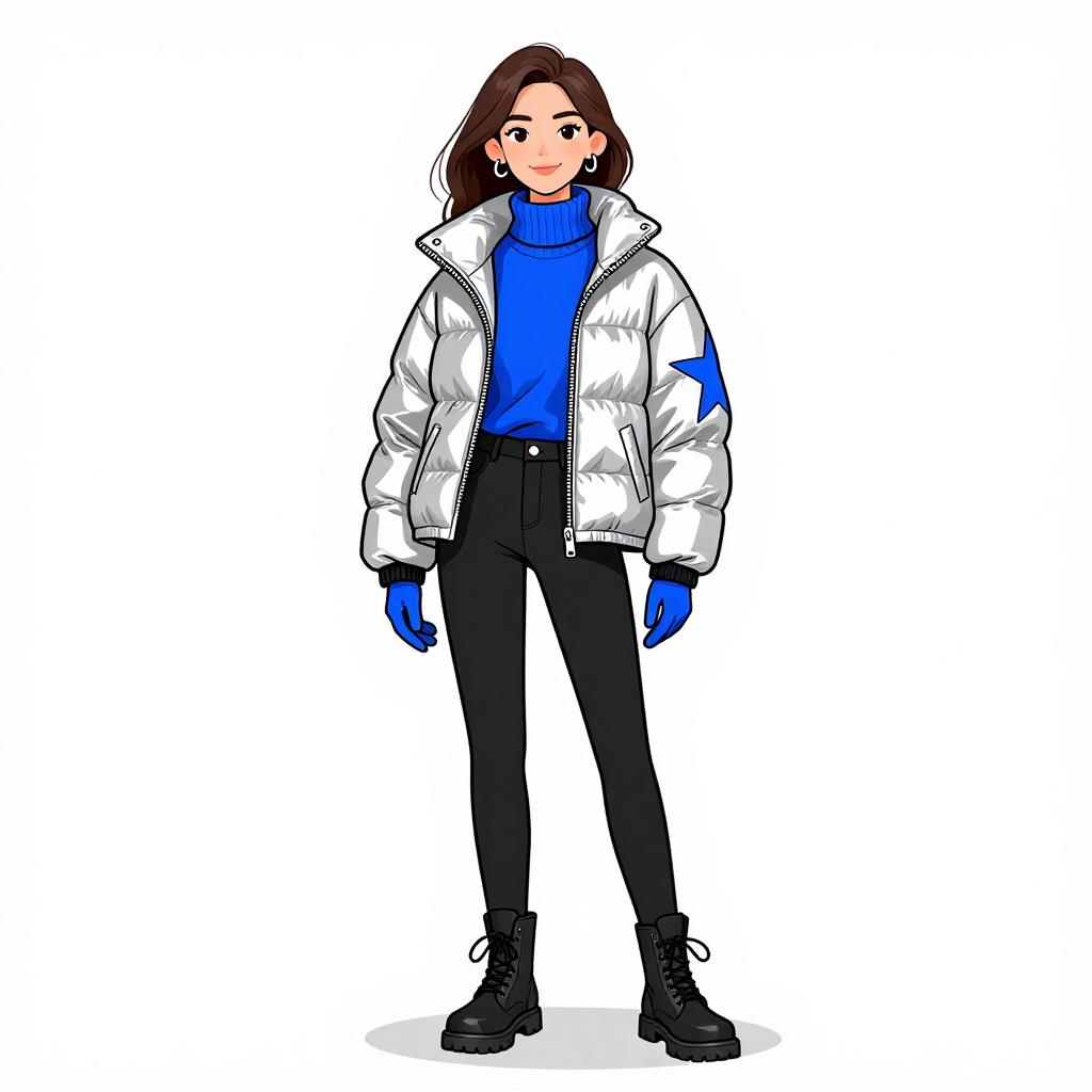 Woman with pretty face and pretty hair. smiling Woman, sporty winter chic, oversized puffer jacket in vibrant blue with large hood and black zippers, matching blue leggings, fitted, glossy finish, black chunky lace-up boots, black visor cap, simple blue gloves, studio background with a light gray floor and stark white backdrop. --sref 1467
