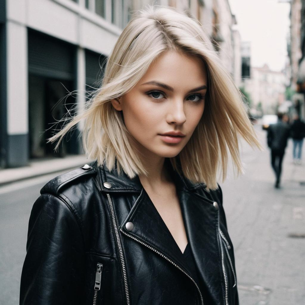 Ash Blonde hairstyle on fashion model, wearing sleek leather jacket, in urban street, captured in fashion editorial style with soft tone.