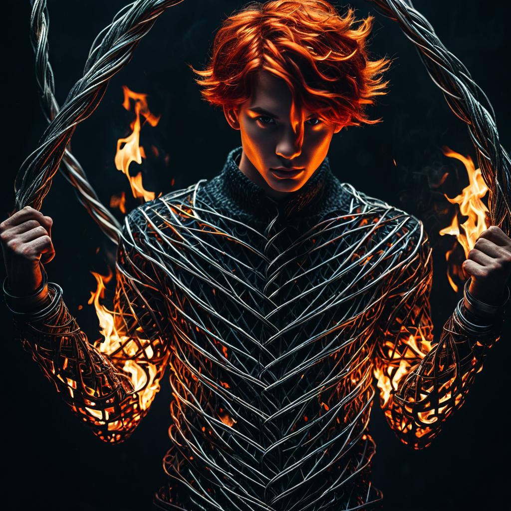 Realistic photo.fire flames as a young man's skin, fiery red hair, amber eyes, full body, masterful shading, twisted steel wire, photorealistic, hyper-realistic details, dark and dramatic color tones, high contrast, intricate patterns, surreal atmosphere, ethereal lighting, haunting and enigmatic emotion, ultra-detailed, cinematic quality, high-resolution 4K, surrealist background, intricate textures, steel reflections.