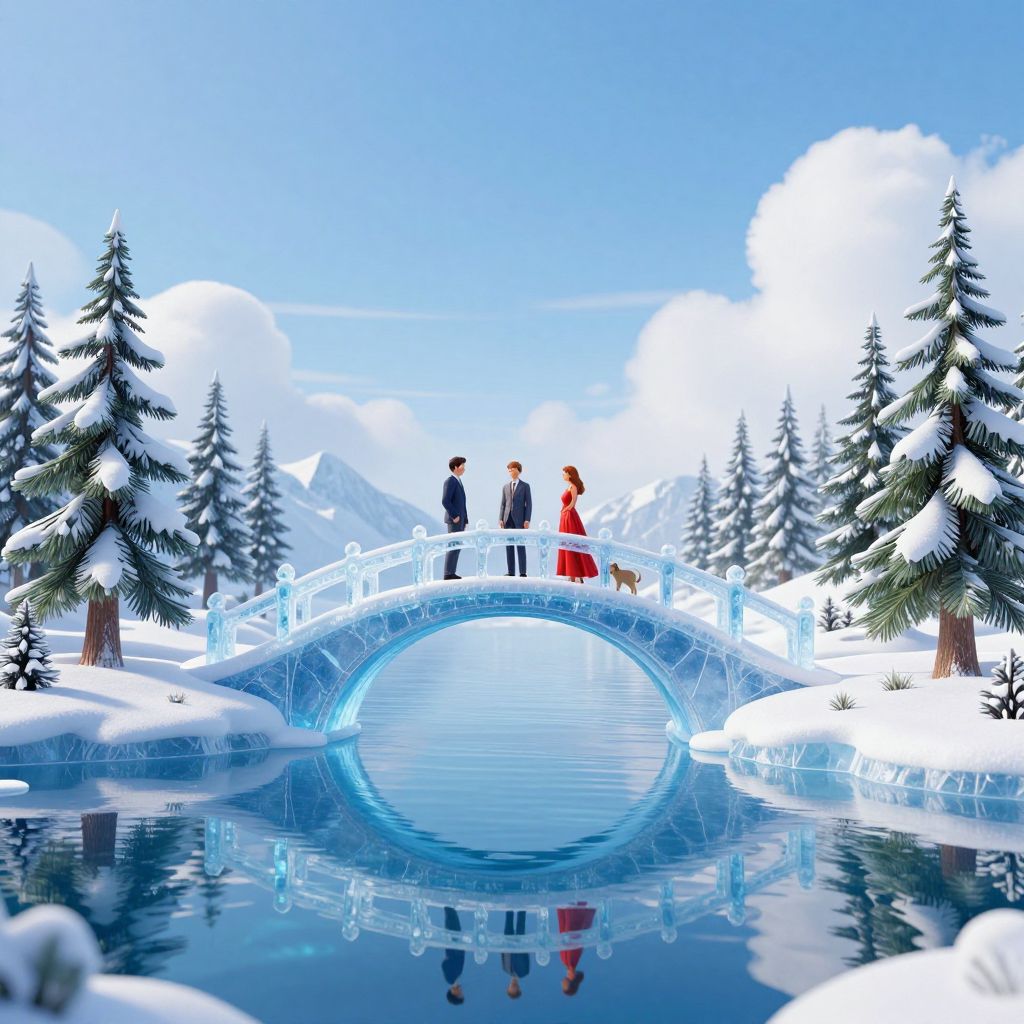 A serene 3D-rendered winter landscape features a delicate ice bridge arching gracefully over a tranquil blue lake, connecting two snow-covered islands adorned with majestic evergreen trees. The bridge, crafted with crystalline precision, reflects the vibrant hues of the sky and water below, while three figures—a man in a suit, another in formal attire, and a woman in a flowing red dress accompanied by a dog—stand atop, embodying a moment of quiet contemplation against the backdrop of a pristine, high-definition arctic scene.