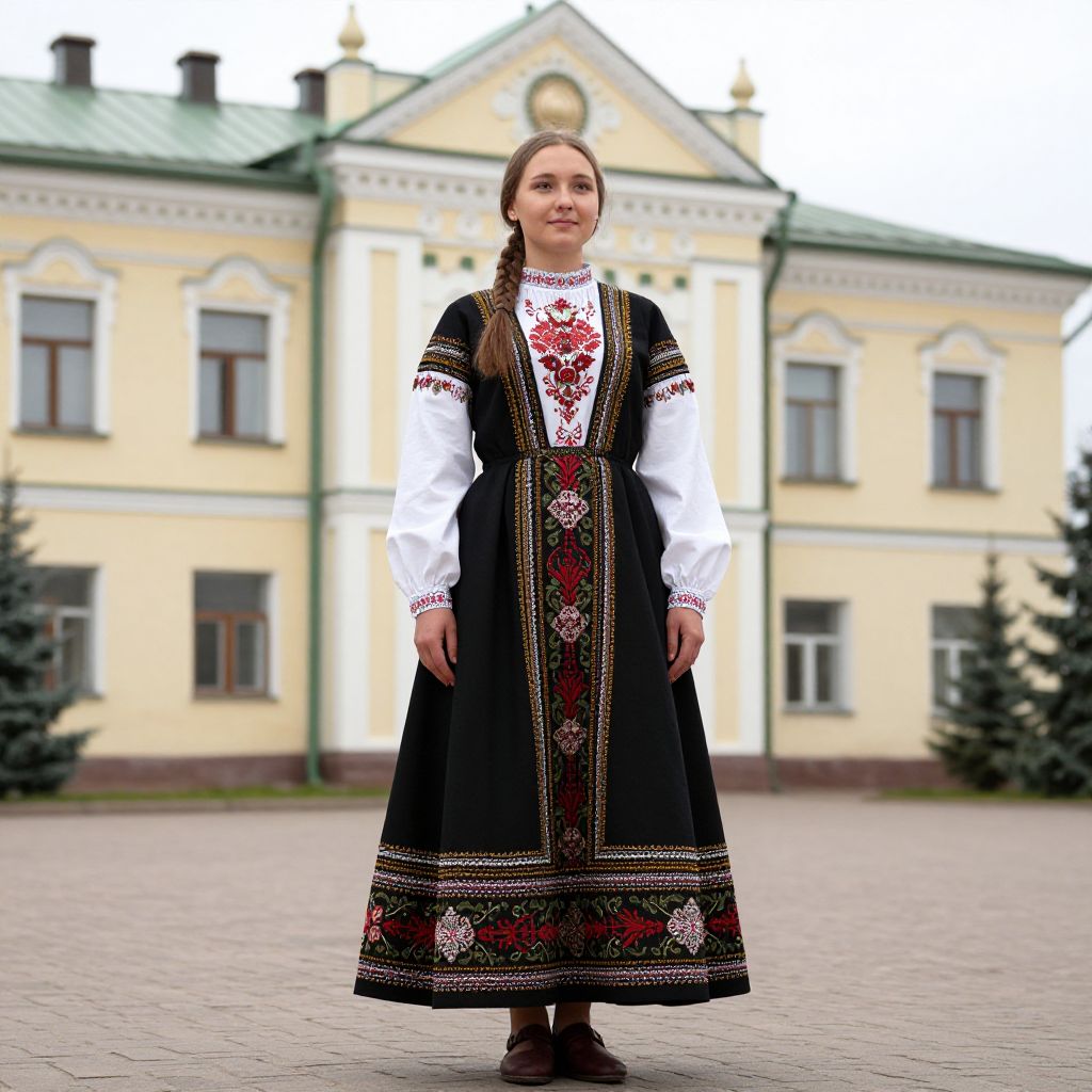 Russian National Costume Female, woman in traditional dress standing in front of a building