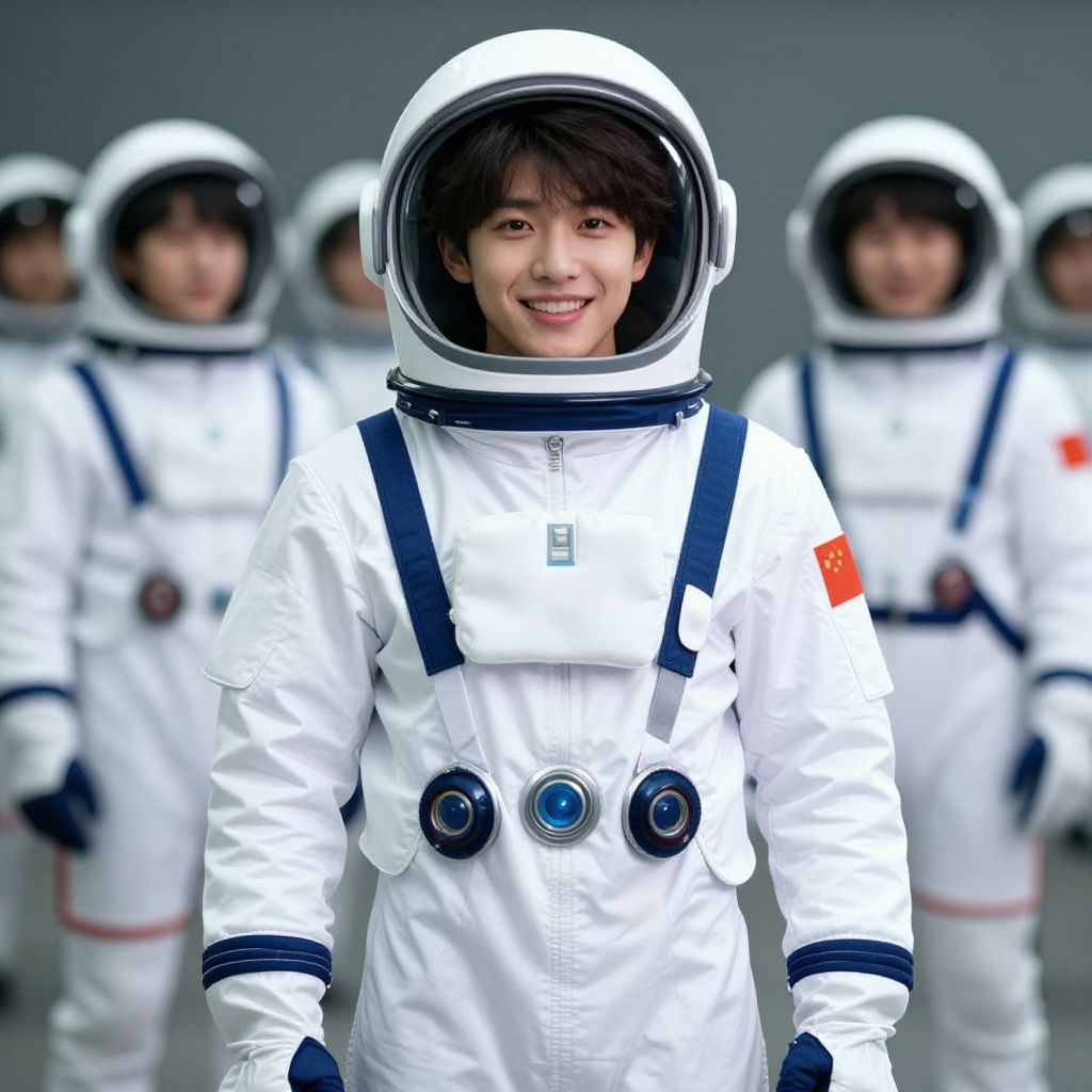 Photograph of a young Asian person with short, dark hair, smiling, wearing a white astronaut suit with a clear helmet, blue straps, and two circular blue buttons on the chest. The suit has a red patch on the right arm. In the blurred background, four other individuals in similar white astronaut suits stand in a row, also with clear helmets. The background is a plain, gray wall, emphasizing the astronauts. The overall image has a bright, clean, and professional feel.
