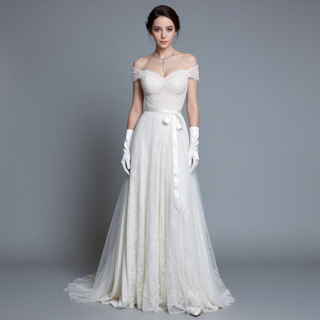 Photograph of a young woman with fair skin and dark hair in an elegant updo, wearing an off-the-shoulder, white lace wedding gown with a fitted bodice and flowing, pleated skirt. She pairs the dress with long, white gloves and a delicate necklace. The gown features intricate lace patterns and a subtle V-neckline. The background is a plain, gradient gray, highlighting the subject. The woman stands confidently, facing the camera, with a neutral expression. The overall style is classic and sophisticated, emphasizing the bridal elegance.
