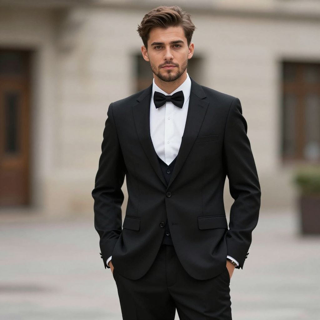 Photograph of a handsome young man with light olive skin and brown hair styled in a modern, slightly tousled fashion. He has a trimmed beard and intense, dark eyes. He is wearing a black tuxedo with a white dress shirt and a black bow tie. His hands are in his pockets, giving a relaxed yet confident stance. The background is blurred, featuring a stone building with dark wood doors and a potted plant to the right. The overall color palette is neutral, with the black suit contrasting against the light stone and gray pavement.